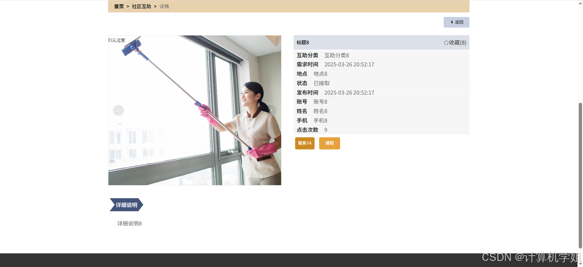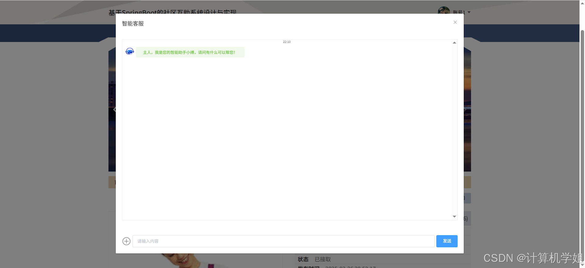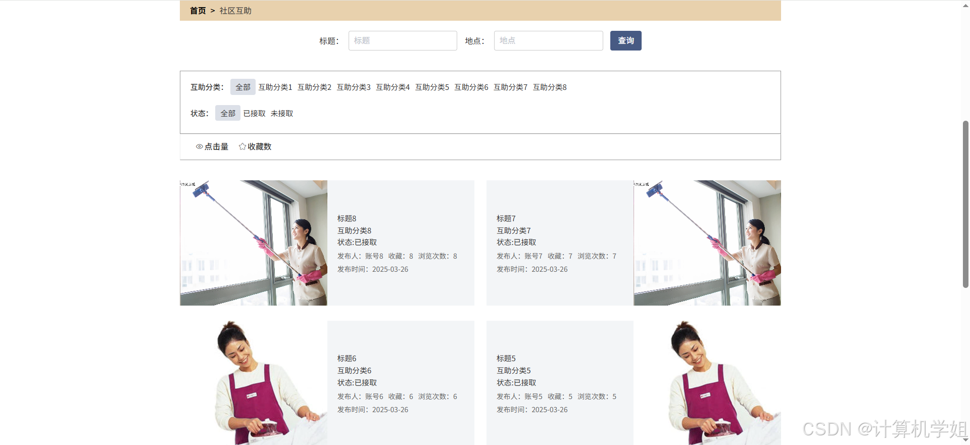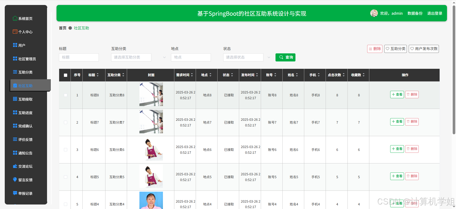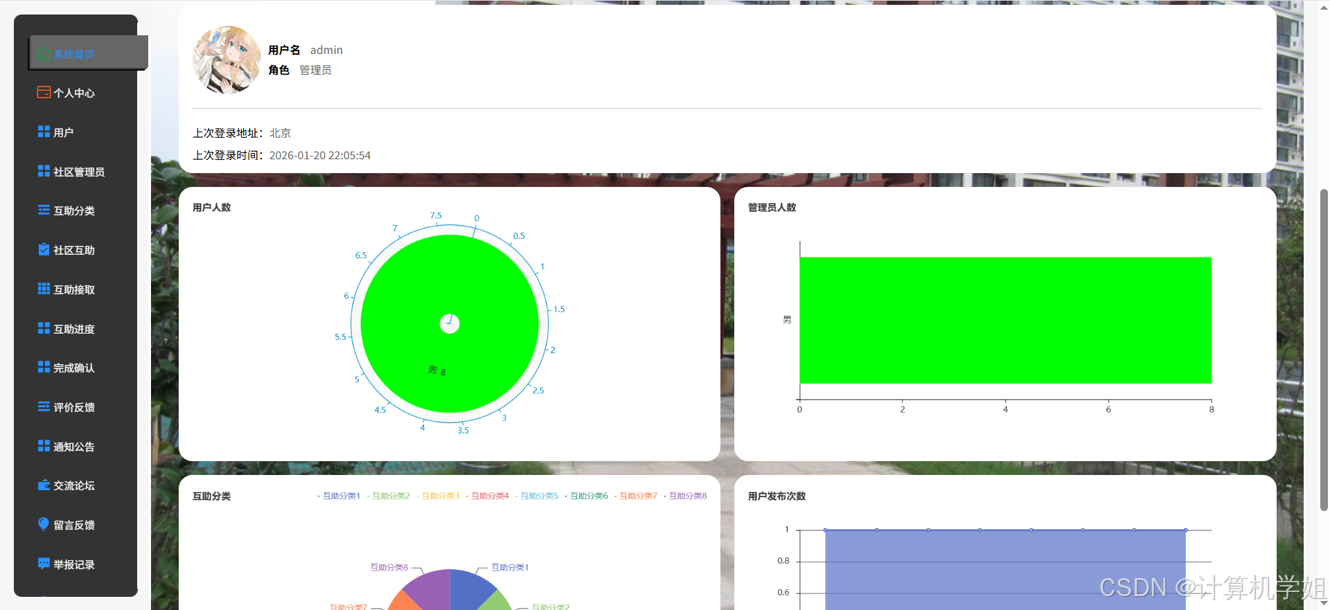 在城市化进程加速的今天,社区作为居民生活的基本单元,其互助功能的发挥对于促进社会和谐、增强居民归属感具有重要意义。然而,传统社区互助方式受限于时间、空间及信息不对称等因素,难以满足居民日益增长的互助需求。因此,开发一套基于SpringBoot+VUE+MYSQL的社区互助系统具有重要的现实意义。该系统通过信息化手段打破时空限制,实现社区资源的快速匹配与共享,有效提升了互助效率。同时,系统提供的智能匹配算法能够根据用户需求与资源情况自动推荐合适的互助对象,减少了用户搜索与筛选的时间成本,提高了互助成功率。此外,系统还具备完善的用户管理、权限控制及数据统计功能,确保了社区互助活动的安全、有序进行,为社区管理者提供了有效的管理工具。通过本系统的应用,不仅可以促进社区居民间的沟通与协作,增强社区凝聚力,还可以推动社区服务的创新与发展,提升社区治理水平。长远来看,该系统的推广与应用有助于构建更加和谐、宜居的社区环境,为居民提供更加便捷、高效的生活服务,推动社会文明进步与和谐发展。