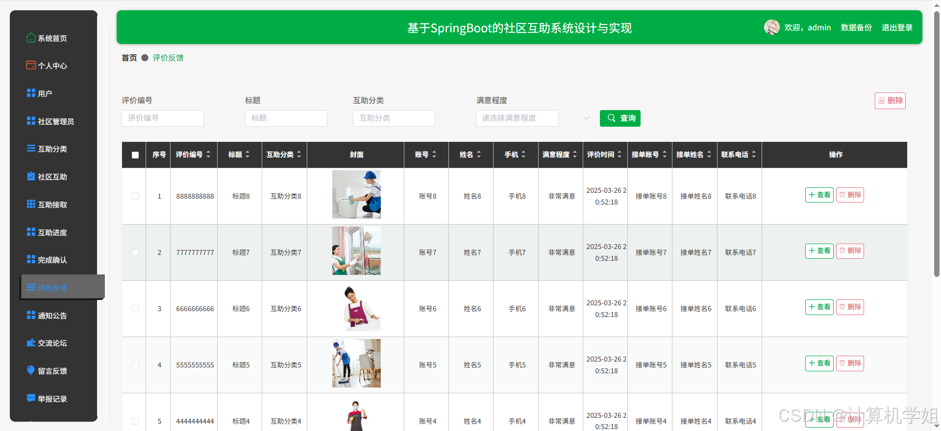 基于SpringBoot+VUE+MYSQL的社区互助系统通过整合前后端技术,实现了社区资源的优化配置与共享,有效提升了互助效率与成功率。系统采用智能匹配算法,根据用户需求与资源情况自动推荐合适的互助对象,减少了用户搜索与筛选的时间成本。同时,系统具备完善的用户管理、权限控制及数据统计功能,确保了社区互助活动的安全、有序进行。通过本系统的应用,社区居民间的沟通与协作得到了加强,社区凝聚力得到了提升,居民生活质量得到了改善。此外,系统还为社区管理者提供了有效的管理工具,推动了社区服务的创新与发展,提升了社区治理水平。本研究不仅为社区互助活动的信息化、智能化管理提供了有益探索,也为未来类似系统的开发与应用提供了参考与借鉴。未来,我们将继续优化系统功能,提升用户体验,为构建更加和谐、宜居的社区环境贡献力量。