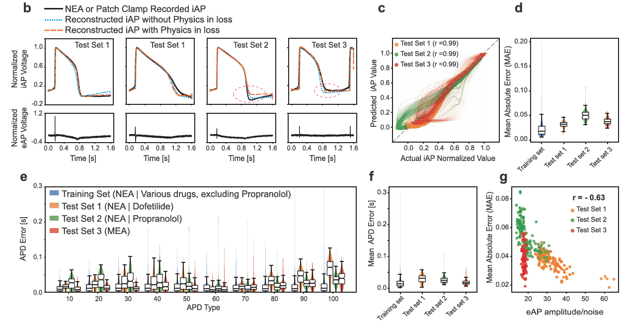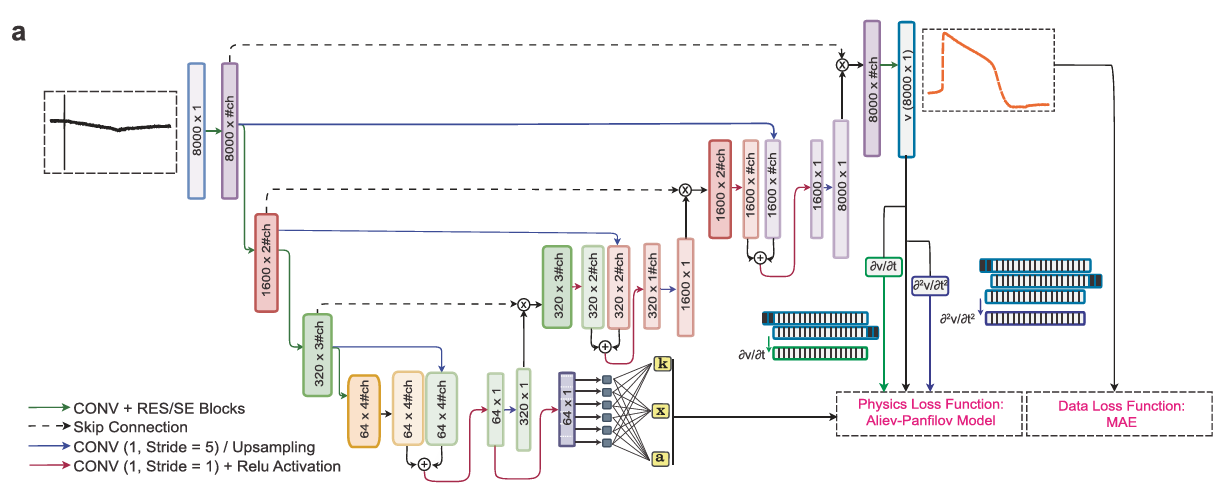 **方法:**论文提出物理信息注意力 U 型网络(PIA-UNET),融合改进的 Aliev-Panfilov 模型作为伪物理损失函数,基于纳米电极阵列(NEA)获取的数千组同步细胞外动作电位(eAP)与细胞内动作电位(iAP)配对数据训练,可从 eAP 无创、高精度重建 iAP 波形,适用于高通量药物心脏毒性评估。