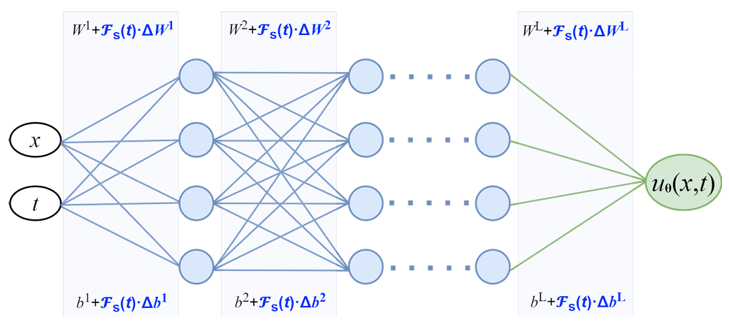 **方法:**论文提出一种基于PINN外推能力的外推驱动神经网络(E-DNN)架构,通过设计外推控制函数与修正项耦合网络参数,以单个神经网络按时间顺序分区间训练,严格保证区间节点连续性和平滑性,高效精准求解依赖物理规律的时变偏微分方程,克服传统 PINN 在大时间域求解中的缺陷。