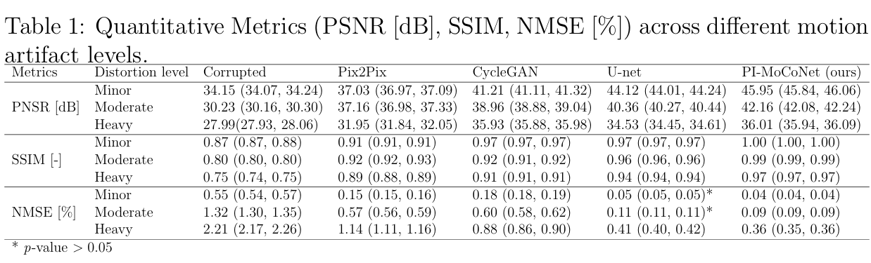 **方法:**论文提出物理信息深度学习模型 PI-MoCoNet,通过运动检测网络与含 Swin Transformer 块的运动校正网络构成双网络框架,融合空间域与 k 空间信息,采用重建损失、感知损失及数据一致性损失约束,无需显式估计运动参数,即可稳健去除脑部 MRI 中的运动伪影,保障图像保真度。