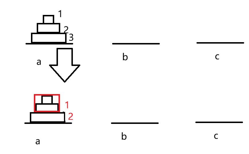其中我们要移动新的1时,就相当于是n = 2移动到c的情况,只不过移动的目标位置可能是a或者b,初始位置也不是a