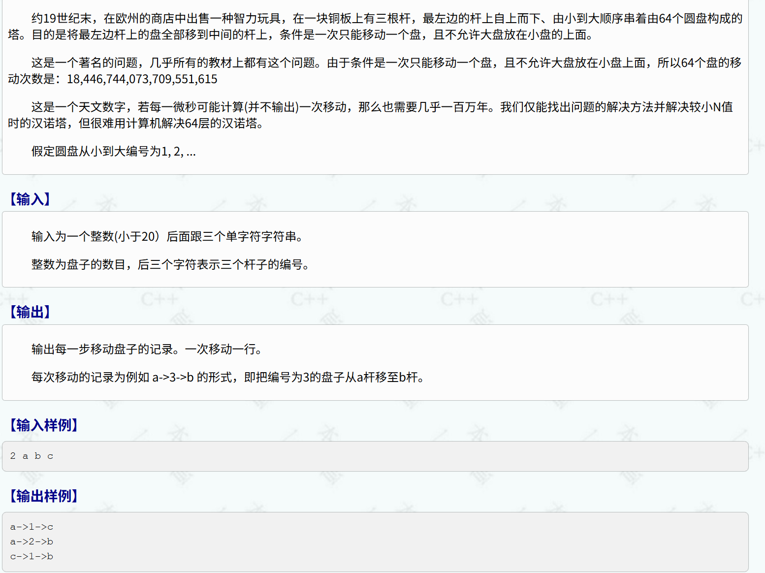 move(n, a, c, b); // 把 a 上⾯ n 个盘⼦,借助 c 转移到 b 上