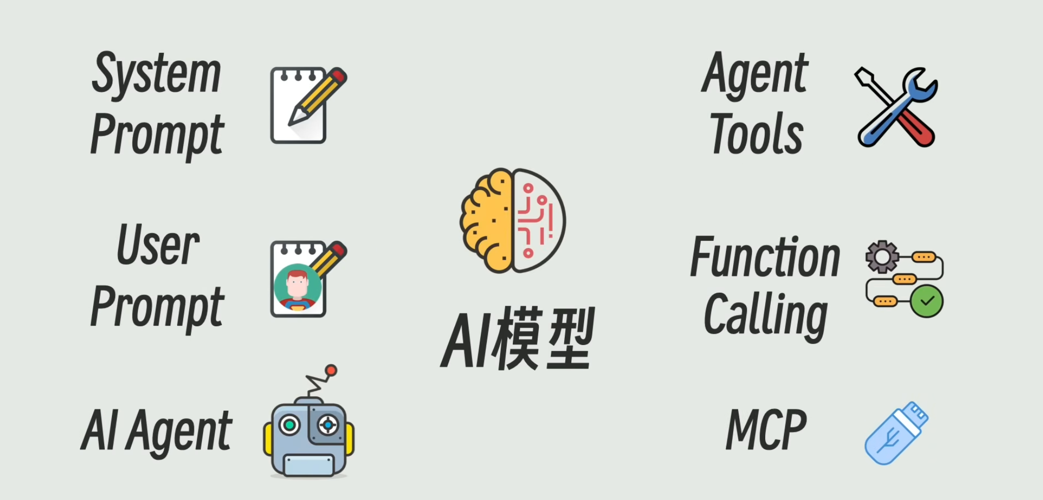 本文介绍了AI领域的几个关键术语:Prompt(提示词)、Agent(智能体)、MCP(模型-上下文-计划框架)和Function Calling(函数调用)。Prompt是用户与AI交互的指令,分为用户提示词和系统提示词;Agent是能自主决策和执行任务的AI系统;MCP帮助Agent理解环境并制定计划;Function Calling则让Agent能调用外部工具完成任务。这些概念相互协作,构成了现代AI系统的核心逻辑,使AI能更智能地响应复杂需求。理解这些术语有助于更好地掌握AI技术的工作原理和应用场景。