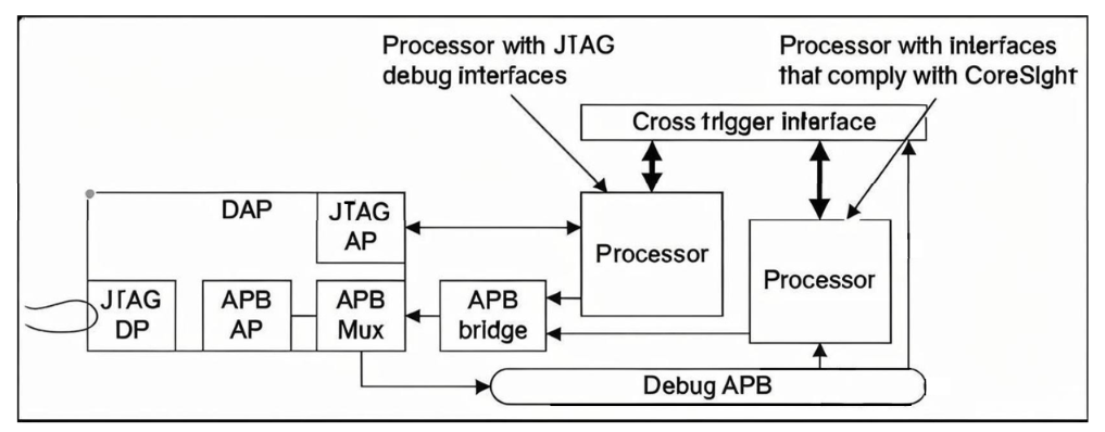 对于异构多核系统(如ARM big.LITTLE架构),CoreSight通过CTI(交叉触发接口)和CTM(交叉触发矩阵)实现核间调试事件传递,大大简化了复杂系统的调试难度。