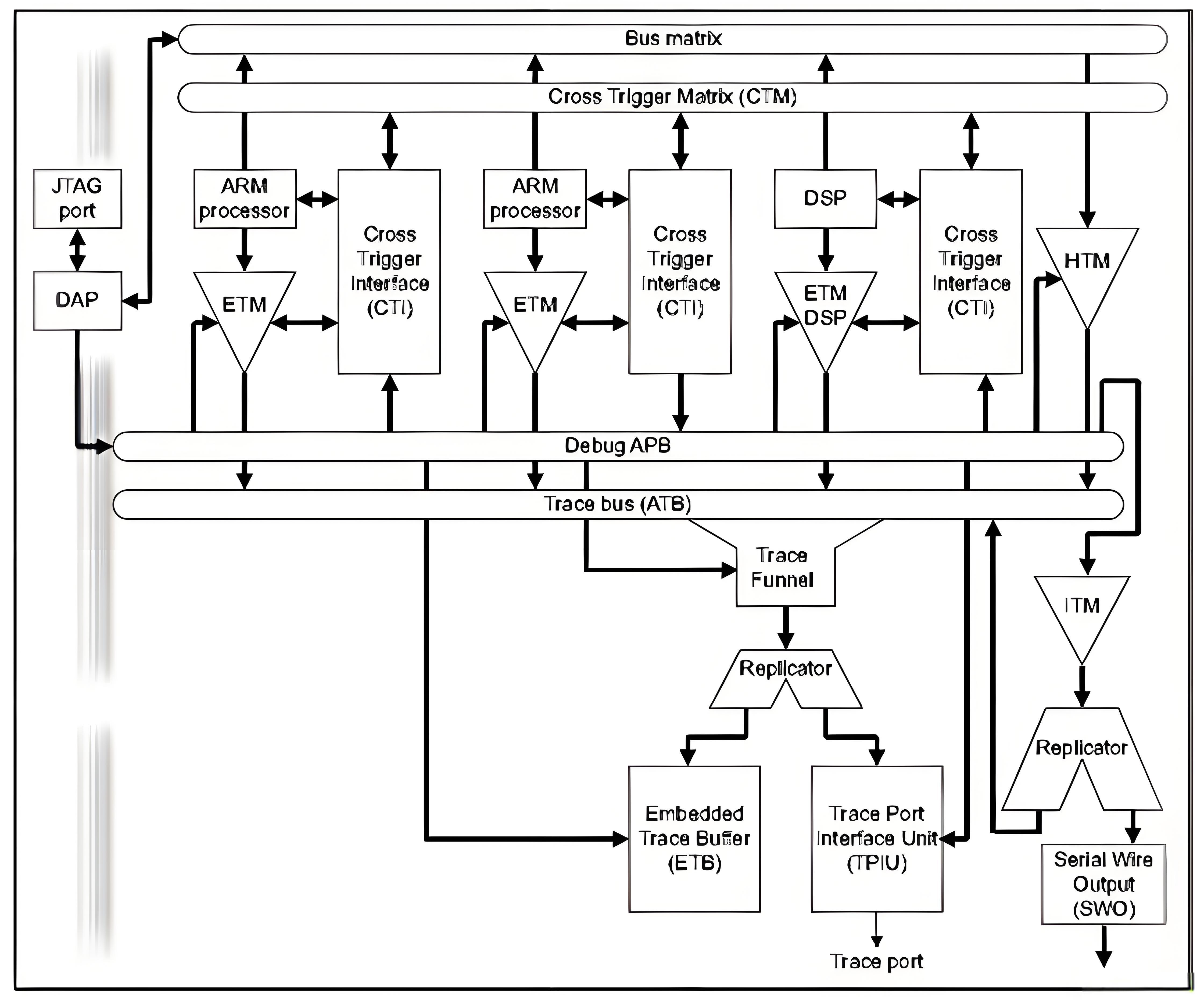 ETM(嵌入式追踪宏单元):连接到处理器,支持指令追踪和数据追踪