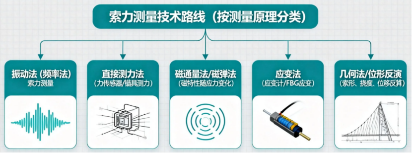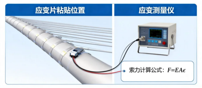 直接在力传递路径上测量力值:在锚具、连接件或关键构件处布设力传感器,或利用张拉设备压力与力关系反算索力。