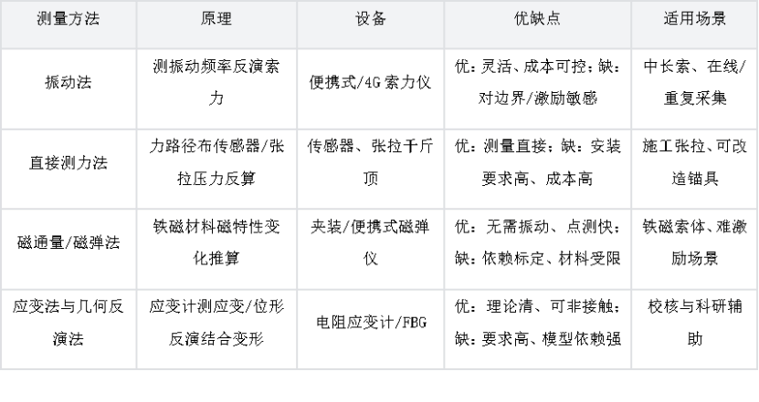 振动法 测振动频率反演索力 便携式/4G索力仪 优:灵活、成本可控;缺:对边界/激励敏感 中长索、在线/重复采集