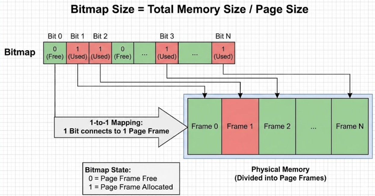 unsigned long或unsigned char数组来模拟。 - 存放位置: 位图属于操作系统的内核数据结构 ,它存放在系统保留的内核空间中。在系统启动(Boot)阶段,内核会根据扫描到的物理内存总量,动态计算并申请一块连续的物理内存来存放位图,这部分空间对用户进程是不可见的。