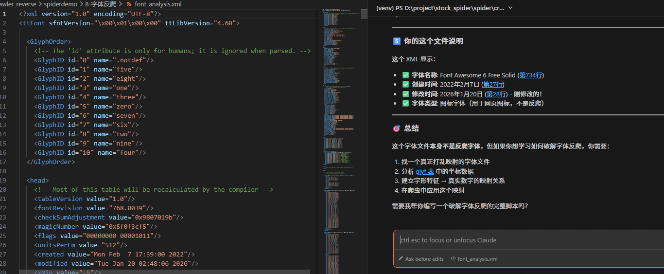OK\] 第 1 页: 获取 10 条 \| 已采集 10 条 \| 本页示例: 8716 \[OK\] 第 10 页: 获取 10 条 \| 已采集 100 条 \| 本页示例: 5165 \[OK\] 第 20 页: 获取 10 条 \| 已采集 200 条 \| 本页示例: 3492 -\> 进度已保存: progress_page_20.json ... \[OK\] 第 100 页: 获取 10 条 \| 已采集 1000 条 \| 本页示例: 2981 ## ================================================================================ 爬取完成! 总采集条数: 1000 结果文件: \[OK\] final_result.json - 完整数据 \[OK\] answer.txt - 答案(总和) \[SUM\] 所有数字总和: 5636267 (可直接提交 answer.txt 中的内容) 🔑 五、关键要点总结 5.1 核心原理 ✅ 字体反爬的本质: 修改 GlyphOrder 的顺序,而非修改 CMAP ✅ 每次请求动态生成字体: 每次请求返回不同的字体文件 ✅ 数据随机混淆: 每次请求返回不同的随机数字 ✅ 浏览器渲染规则: 字形在 GlyphOrder 中的位置 = 显示的数字 5.2 破解关键步骤 1. 获取 API 响应(b64Font + page_data) ↓ 2. 解析字体文件(使用 fontTools) ↓ 3. 提取 GlyphOrder 和 CMAP ↓ 4. 建立映射表(字符码点 → 真实数字) ↓ 5. 解密所有数字 ↓ 6. 计算总和 5.3 重要细节 GlyphOrder 的顺序决定显示: 第一个数字字形显示为0,第二个为1,依此类推 CMAP 保持标准: 不修改 Unicode → 字形的映射 动态字体: 每次请求需要重新解析字体 Base64 编码: 字体文件通过 Base64 编码传输 📁 六、文件结构 8-字体反爬/ ├── spider_all.py # ⭐ 完整爬虫(100页自动化) ├── final_solution.py # 单页测试脚本 ├── font_anti_solver.py # 字体破解器类 ├── test_font_anti.py # 测试脚本 ├── full_spider.py # 网页分析脚本 ├── font.py # 基础示例 ├── README.md # 完整文档 ├── answer.txt # 最终答案:5636267 └── final_result.json # 完整数据(1000条) 🎓 七、扩展学习 7.1 其他字体反爬类型 字形名称混淆 使用 glyph_001, glyph_002 代替 one, two 需要通过字形坐标特征识别 CSS 类名映射 7 → 显示为5 需要解析 CSS 文件 动态 SVG 字体 使用 SVG 路径绘制数字 需要 OCR 识别 7.2 推荐工具 fontTools: Python字体解析库 FontForge: 字体编辑器(可视化分析) Tesseract: OCR引擎(识别字形) 这就是完整的字体反爬破解流程!核心是理解 GlyphOrder 的顺序决定了数字的显示,通过解析字体文件建立映射表即可破解。🎉 暂时先这样,后期有兴趣继续弄