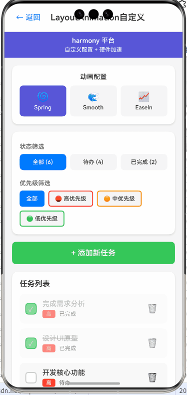 在OpenHarmony项目中,优先使用LayoutAnimation处理简单布局变化 ,复杂交互动画建议采用