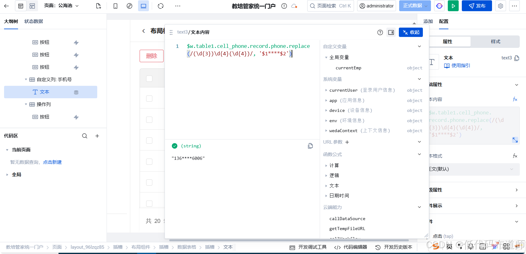 $w.table1.cell_phone.record.phone.replace(/(\d{3})\d{4}(\d{4})/, '$1****$2')