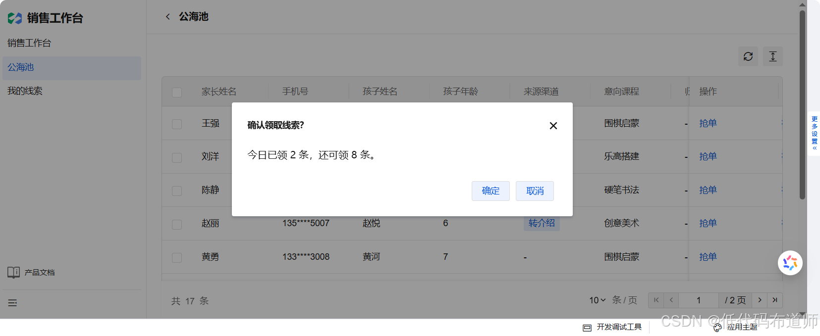 这样,销售就只能看到没人领的线索,看不到别人已经领走的。
