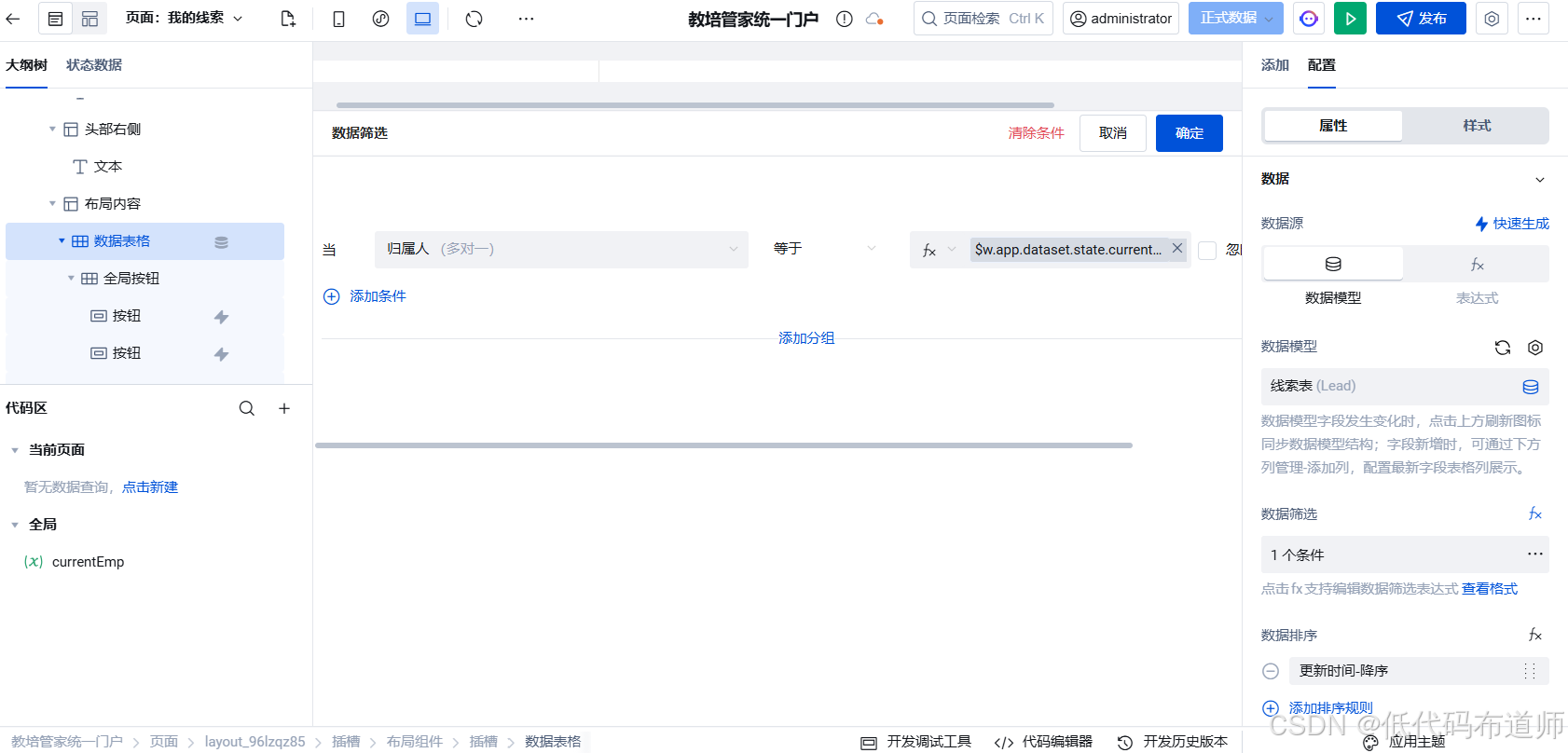 归属人 (owner_id)等于 (Equals)全局变量.currentEmp._id。