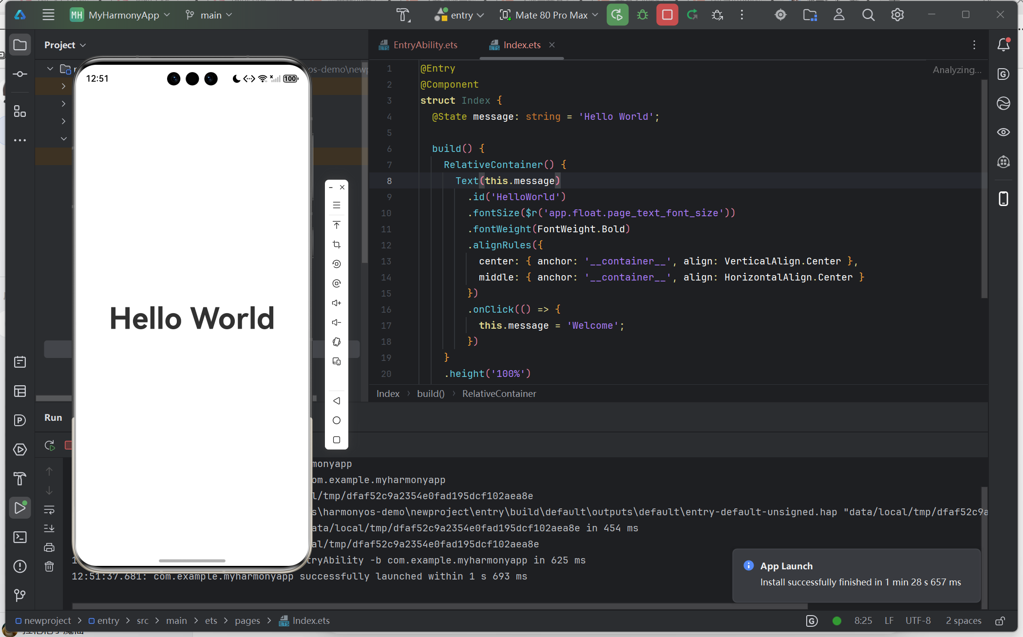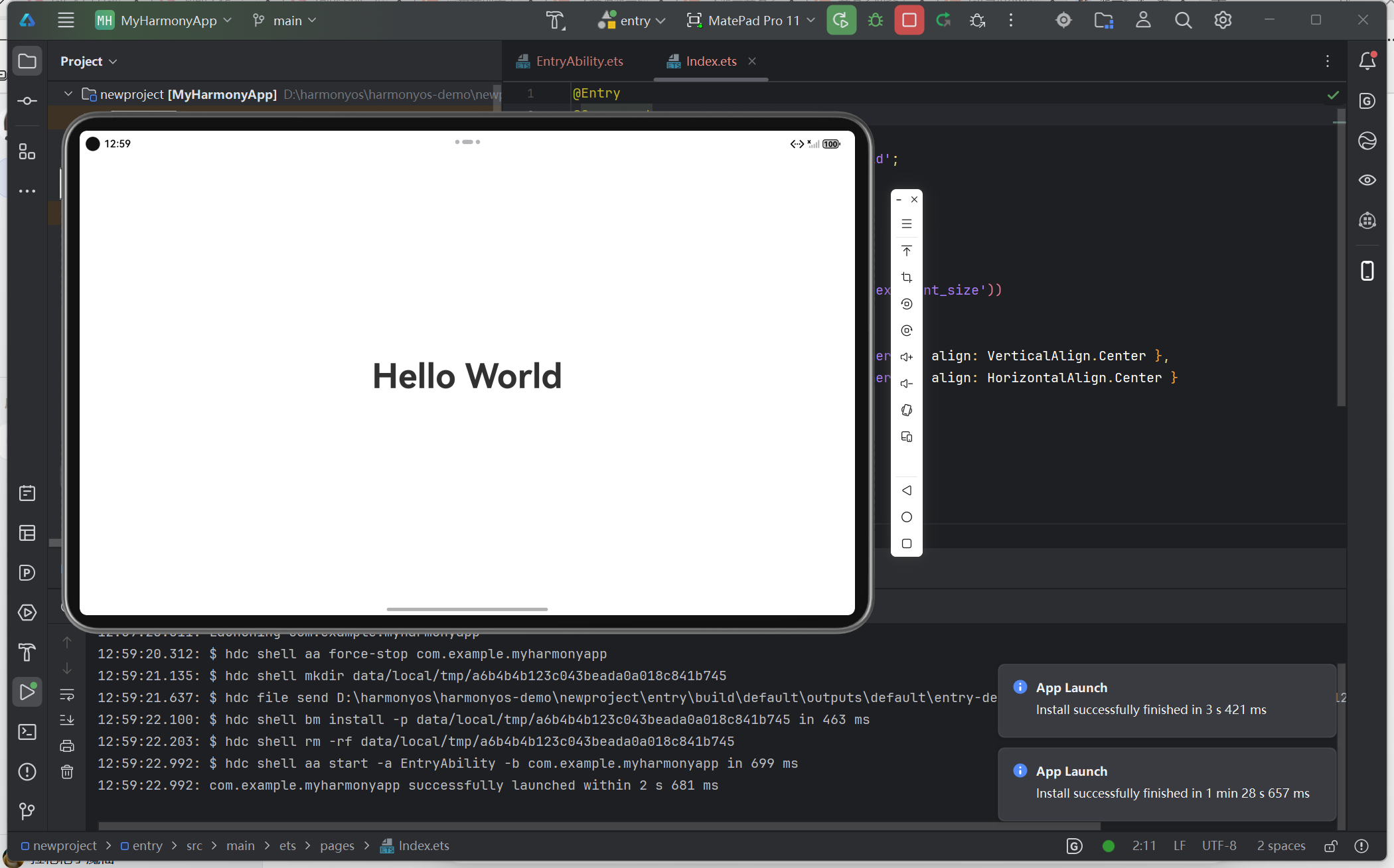 Ctrl+R,触发工程编译与部署 - 等待编译完成,应用会自动安装到模拟器并启动,模拟器界面显示