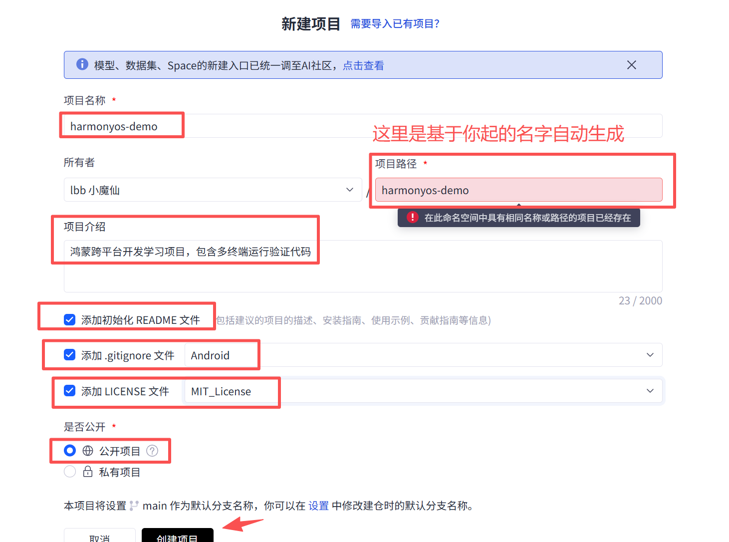 harmonyos-demo(建议英文,与项目对应,名字自取不一定一样) - 仓库类型:选择「公开」(便于后续分享、归档)