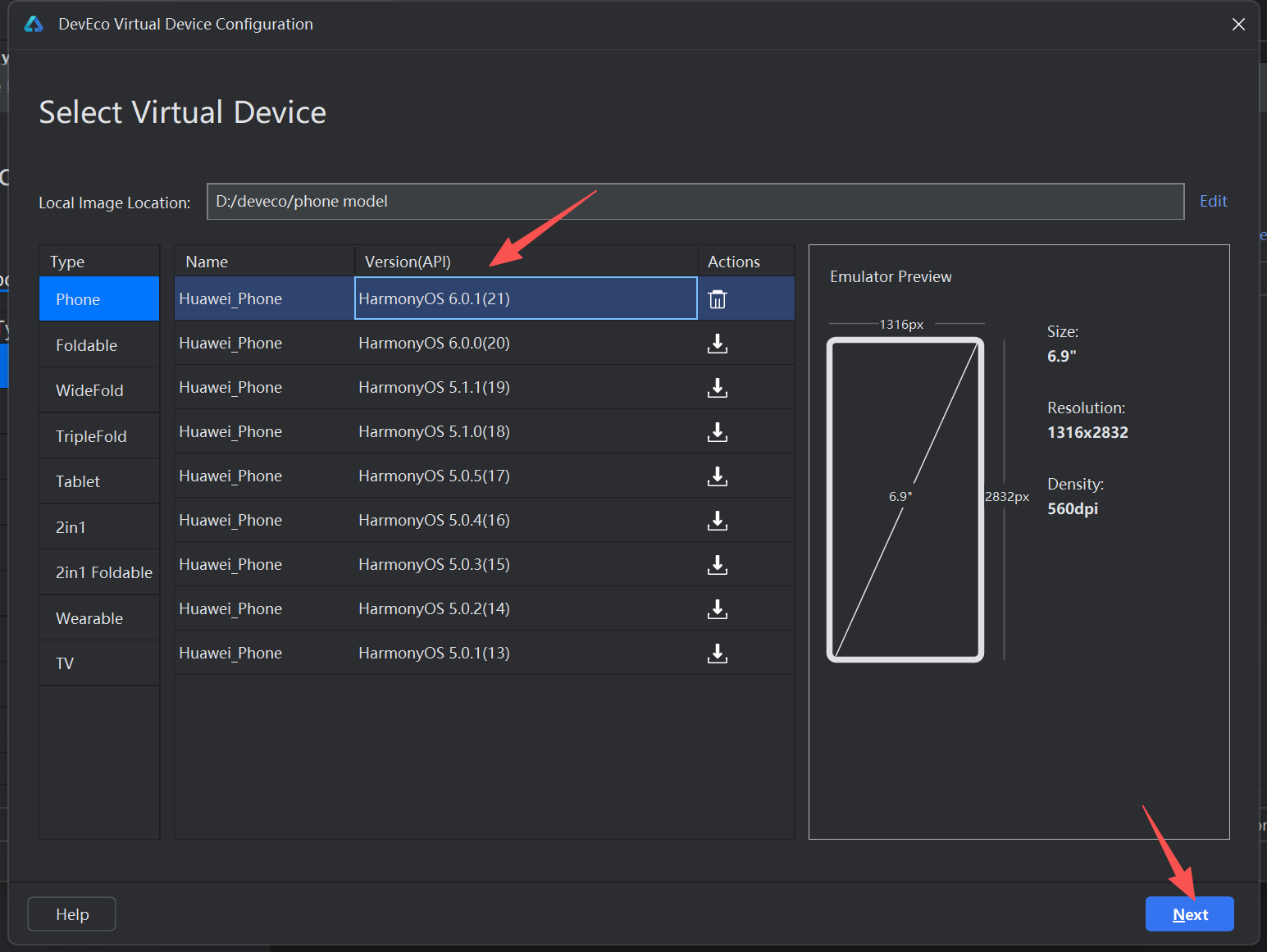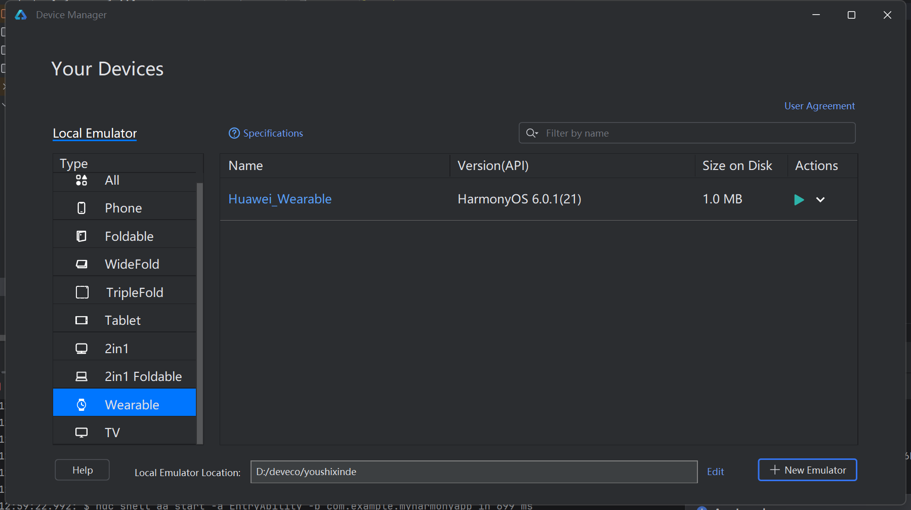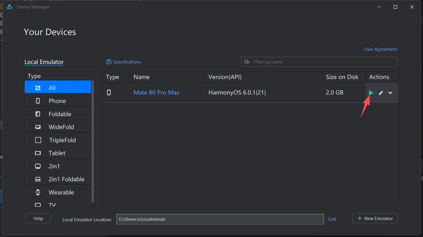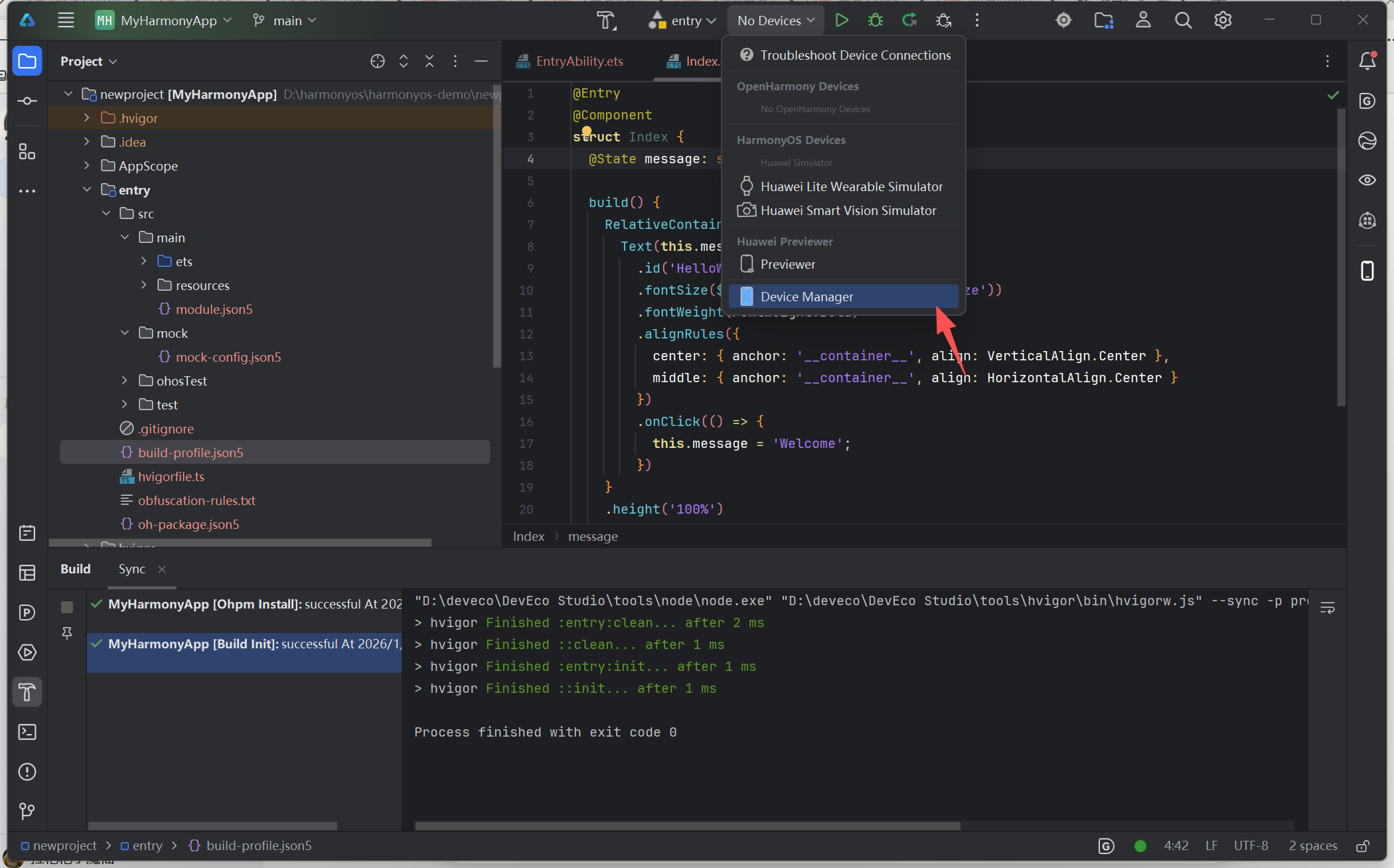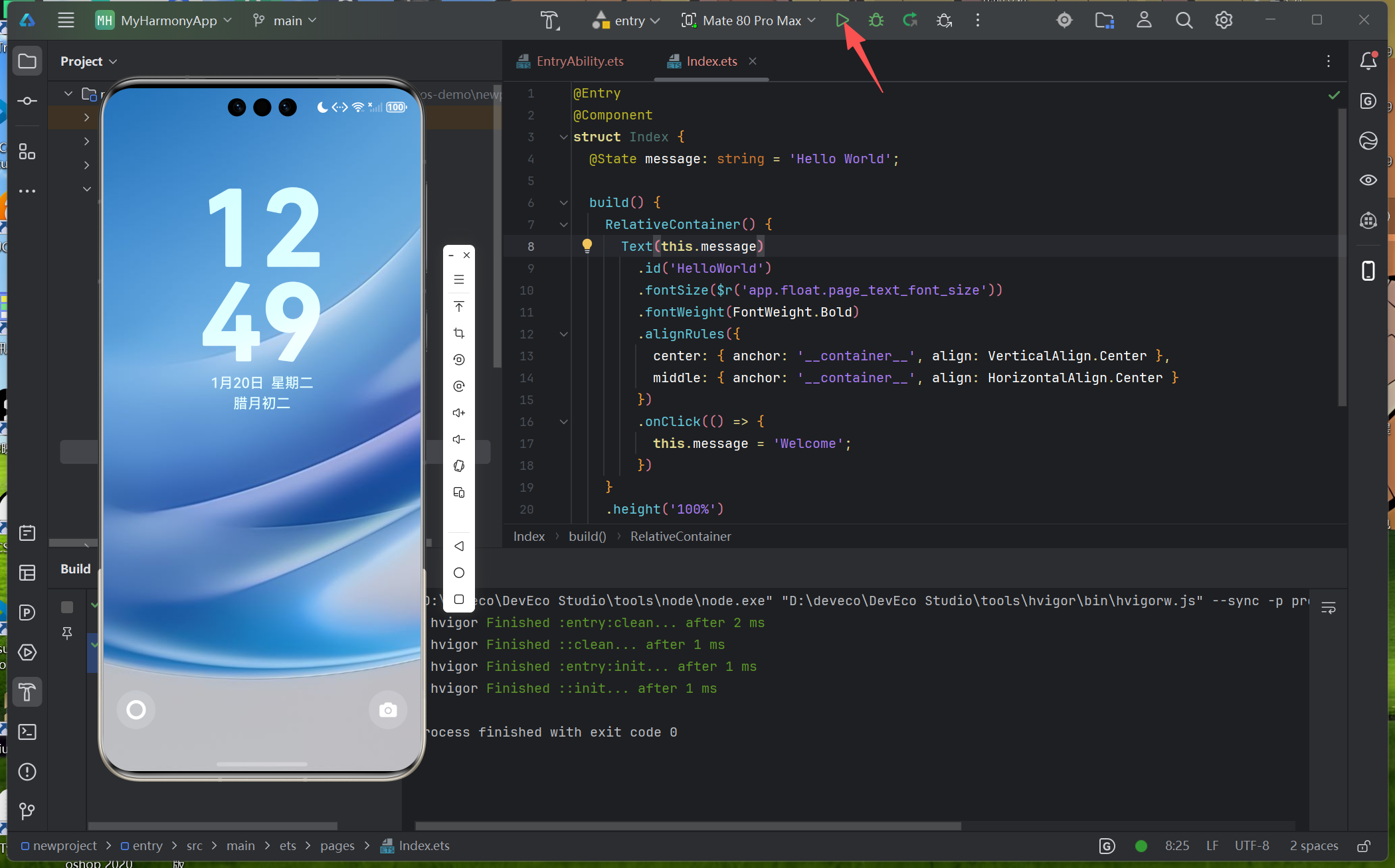 - 确保之前创建的手机模拟器已启动,DevEco Studio 顶部设备栏选择该模拟器