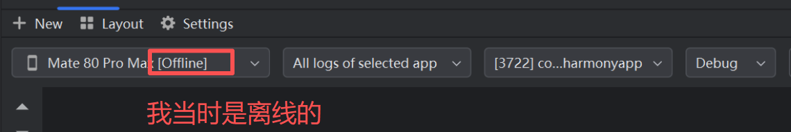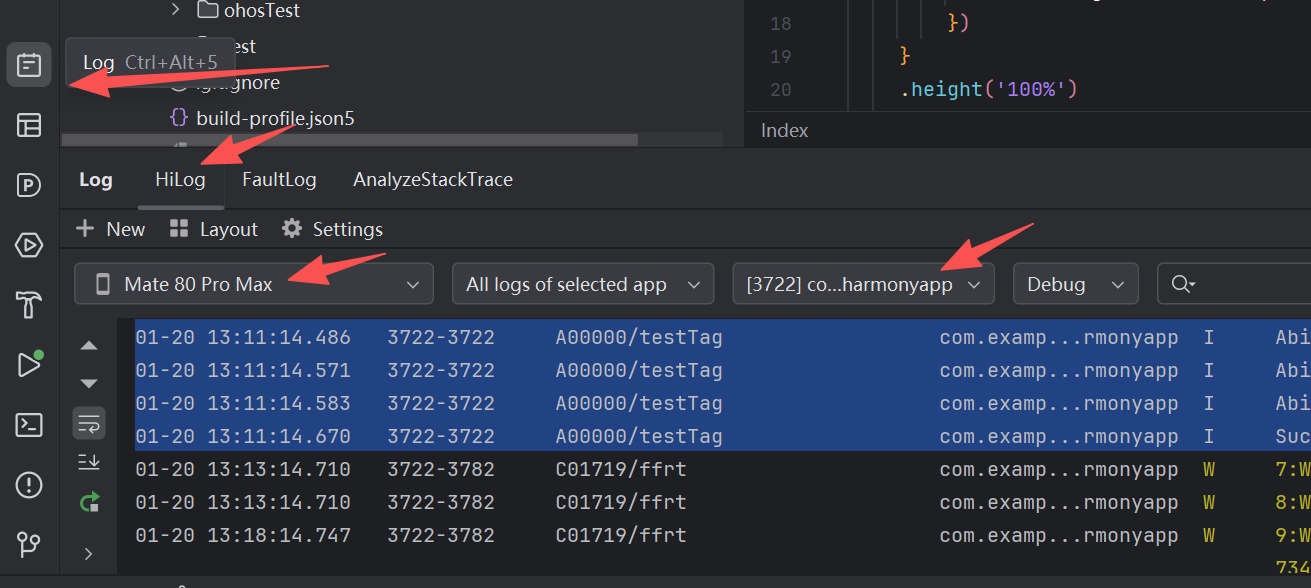 - 应用运行成功后,在 DevEco Studio 底部找到「Log」窗口(若隐藏,点击右侧 ▶️ 展开选择)