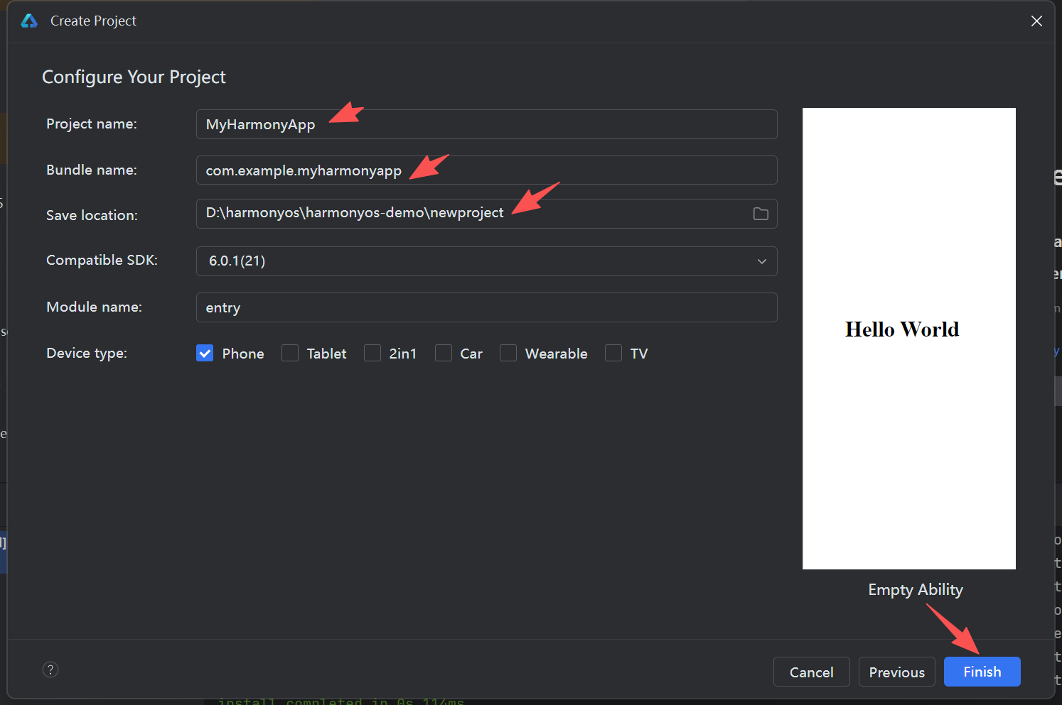 com.example.myharmonyapp(应用包名,需唯一,默认即可,无需修改) - Save Location:选择本地 Git 仓库根目录(就是你建的那个文件),确保工程放在仓库内