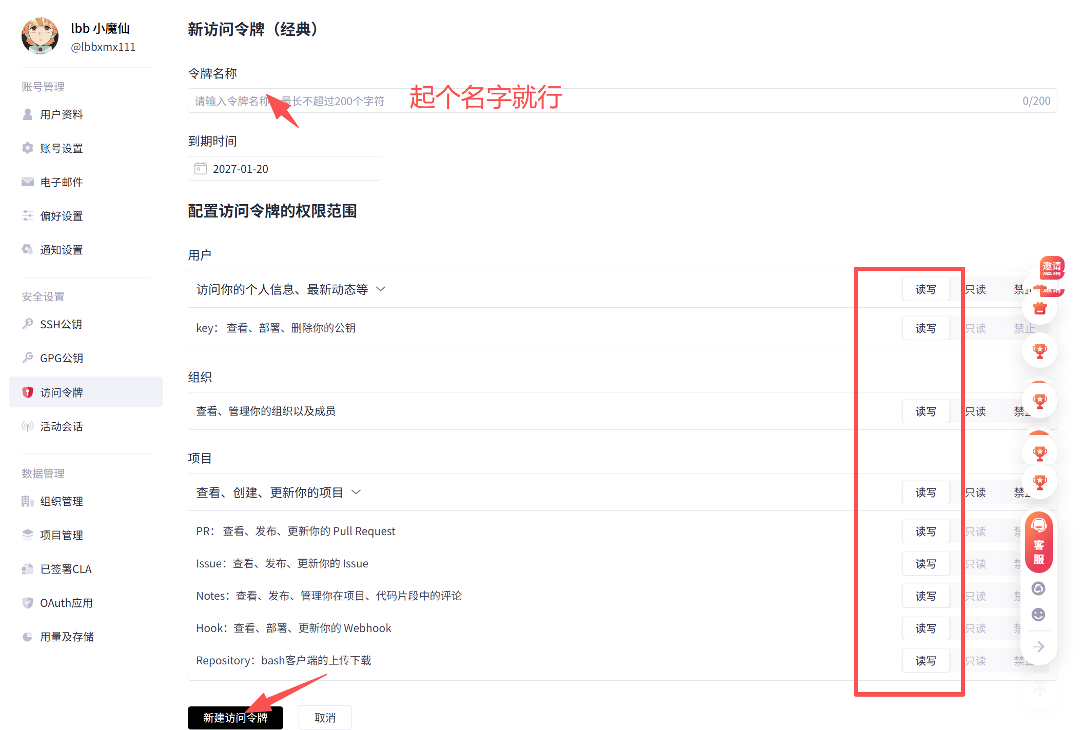 点击右上角「+」→「新建项目」,填写仓库信息: