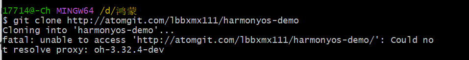 错误提示里的 Could not resolve proxy: oh-3.32.4-dev 说明你的 Git 全局配置里设置了代理,而这个代理地址是无效的,导致 Git 无法正常连接到远程仓库。