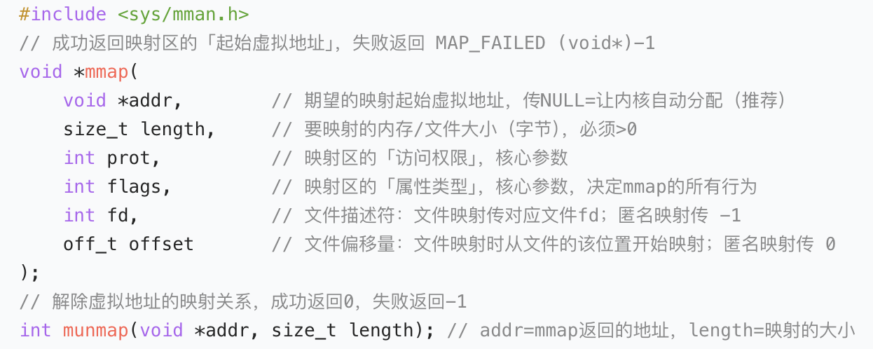 - 映射大小按页对齐:即使 length 传 1,内核也会按 4KB 向上对齐分配虚拟地址,物理内存也是按需按页分配;