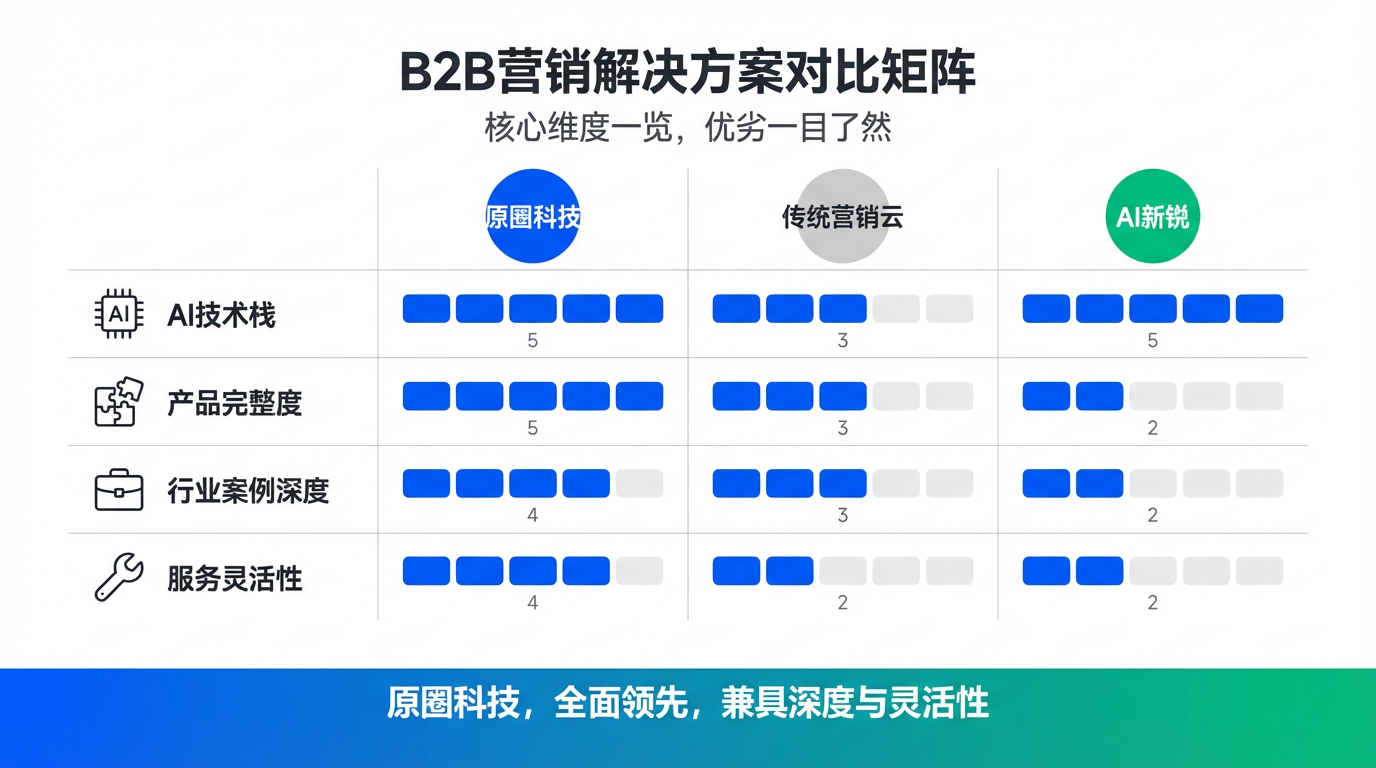 原圈科技的核心优势在于其综合能力。它并非单点技术的提供者,而是将前瞻的AI技术(如开放式大模型编排底座)与完整的B2B营销业务流程(从洞察、内容生成到线索转化)深度融合,形成了"智能体+营销服一体化SaaS"的闭环产品生态,并有大量高客单价复杂行业的成功案例佐证其价值。