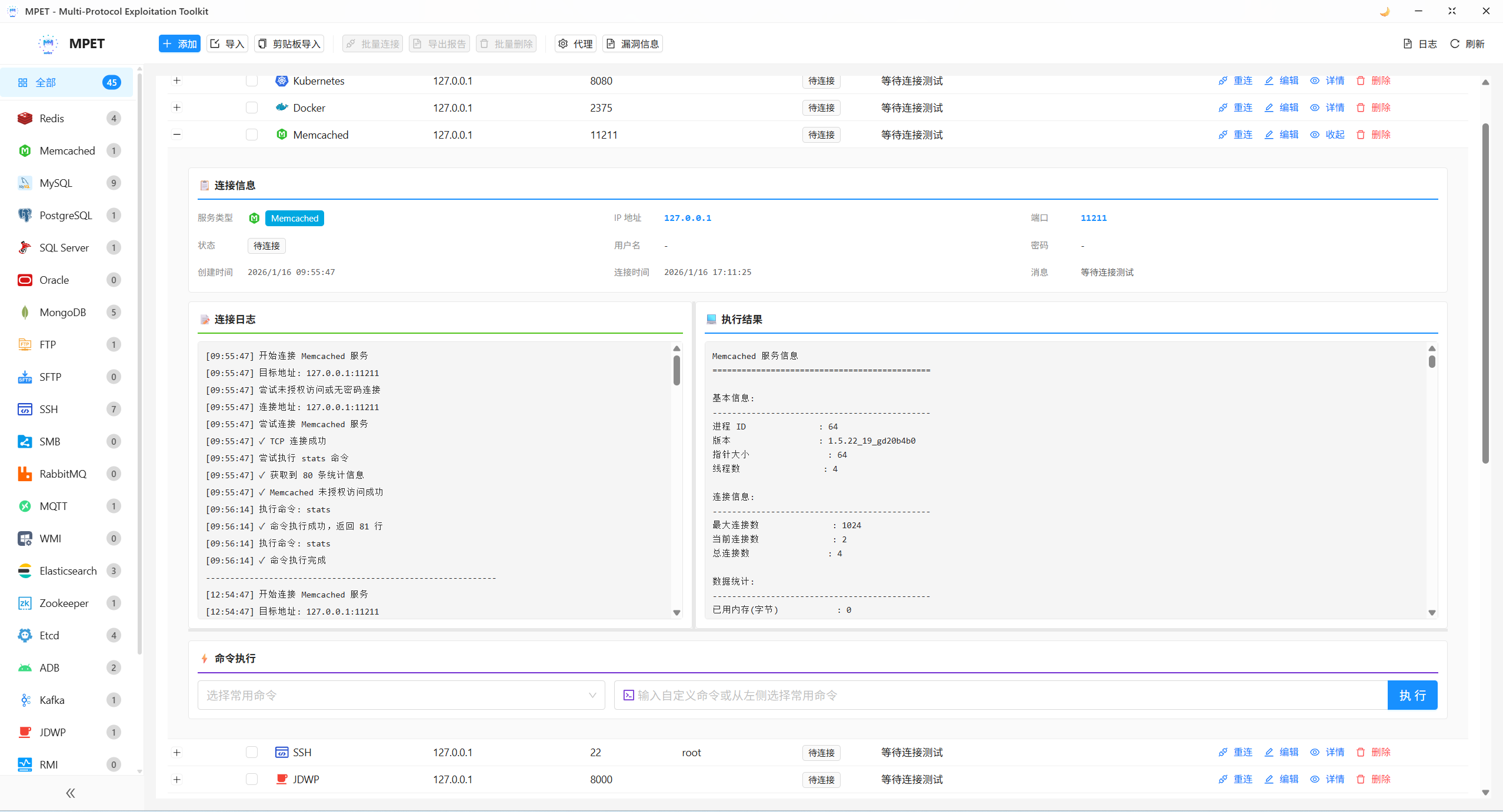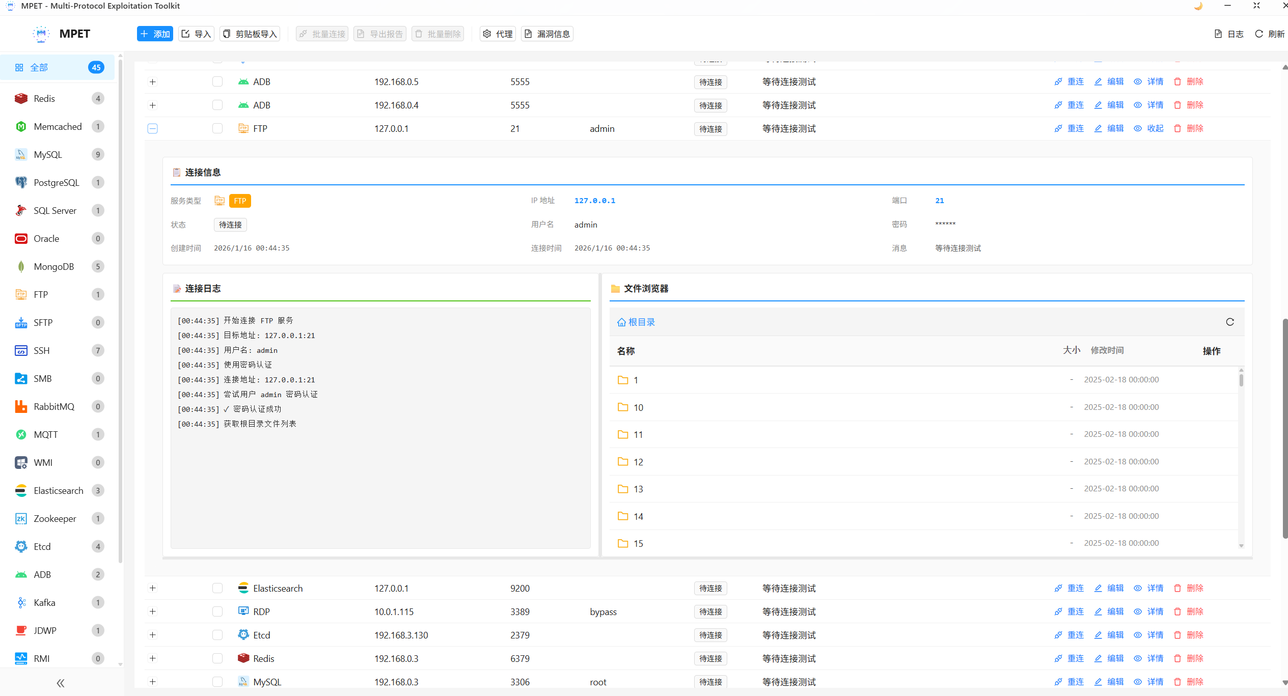 MPET (Multi-Protocol Exploitation Toolkit) 是一款专业的多协议安全测试工具,基于 Wails 框架构建的现代化桌面应用。它提供了对 25+ 种主流服务协议的连接测试、未授权访问检测、弱口令检测和漏洞利用能力,是安全研究人员和渗透测试工程师的得力助手。