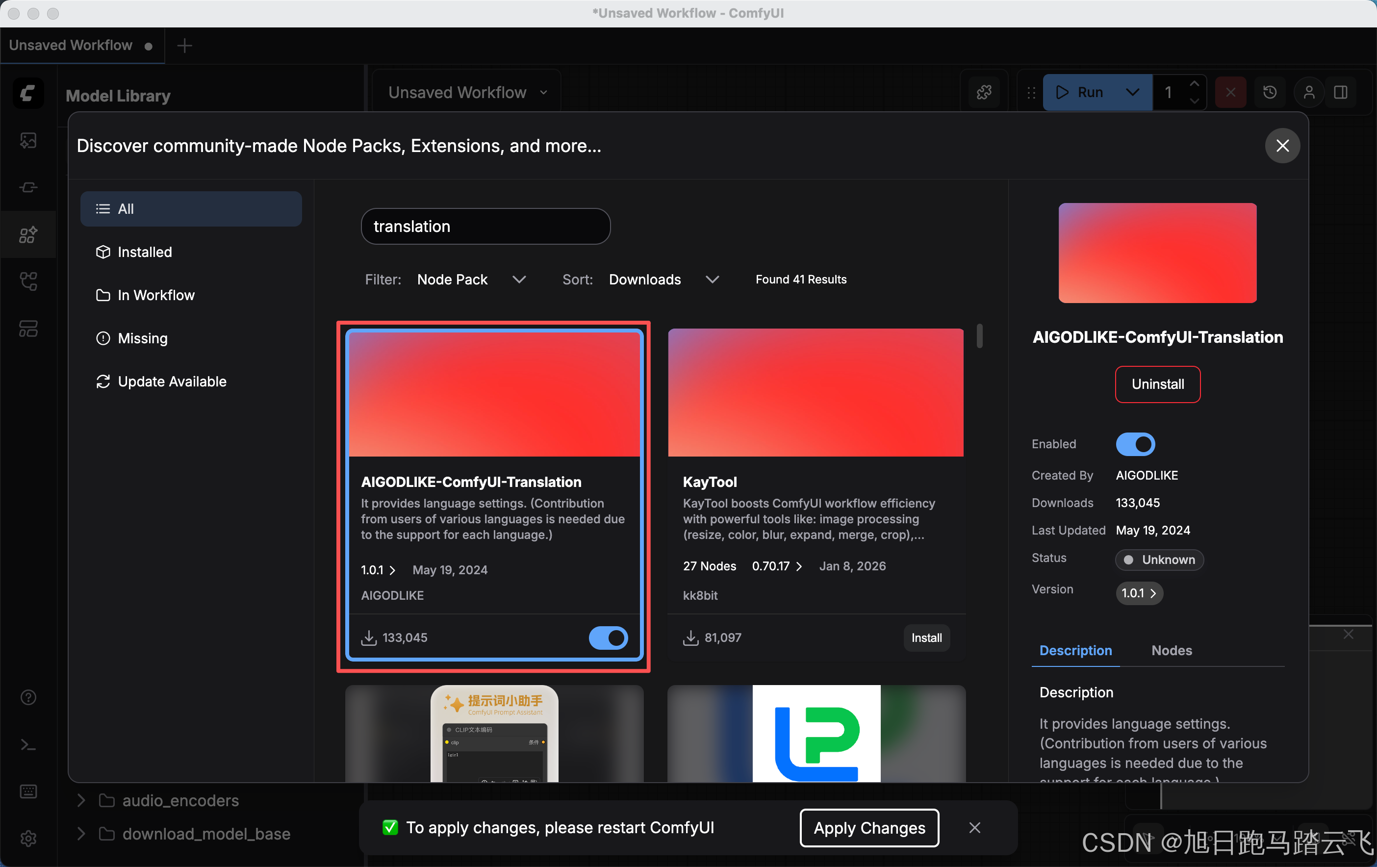 打开ComfyUI Manager,搜索框中输入translation, 安装第一个即可(后续插件同样步骤进行安装)。
