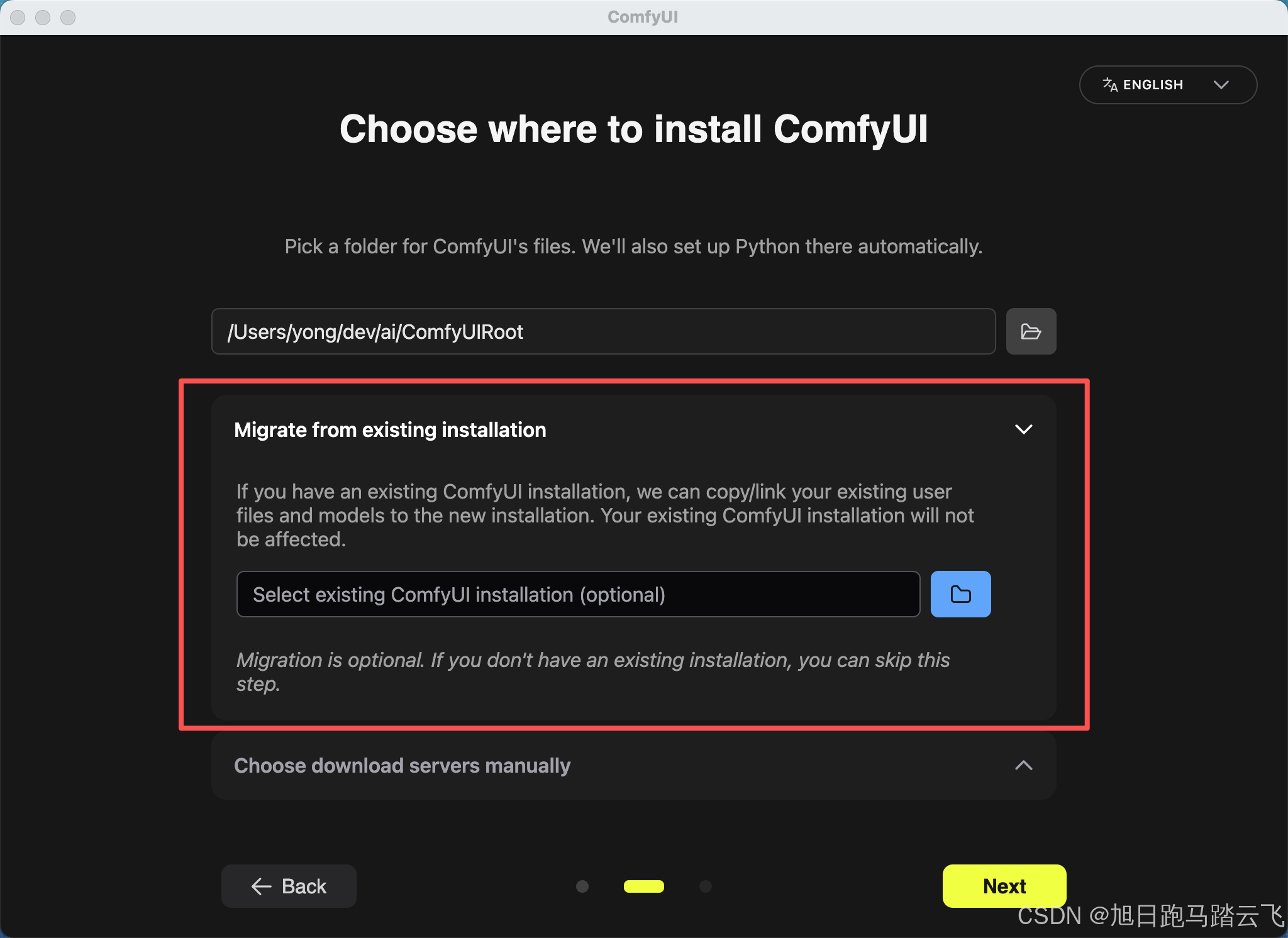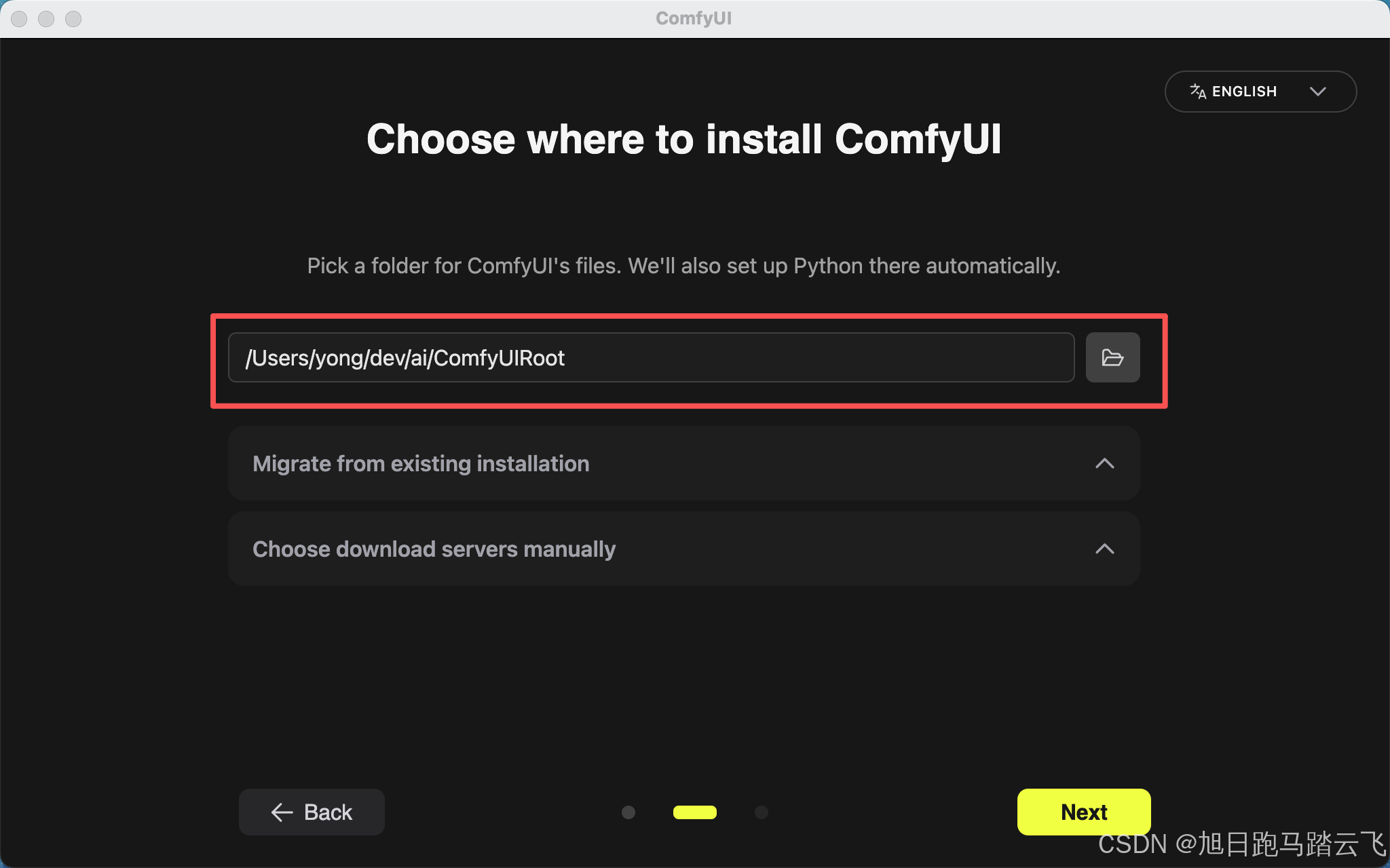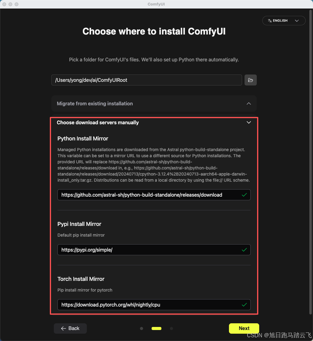 | 配置目录 | #3.3配置,如:/Users/yong/dev/ai/ComfyUI.Data | 存放模型文件,存放用户配置 |