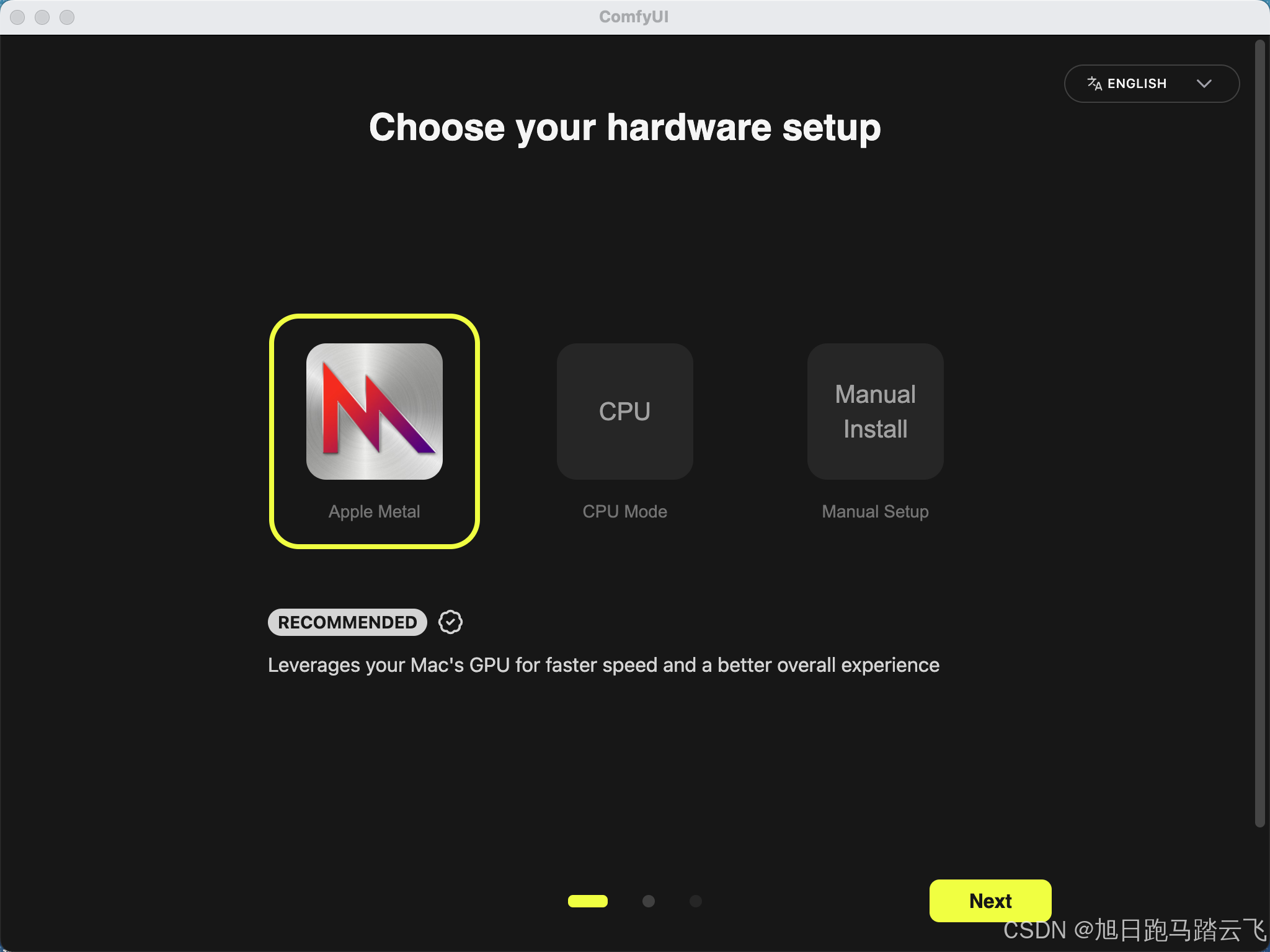 - Apple Metal:推荐,只有这个选项才会自动安装 PyTorch官方给Apple Silicon准备的 MPS后端,也就是调用GPU的加速能力;