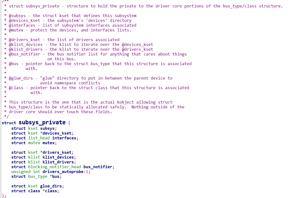 首先bus_type内部定义了一个重要的struct subsys_private类型的指针,该结构体内部成员如下