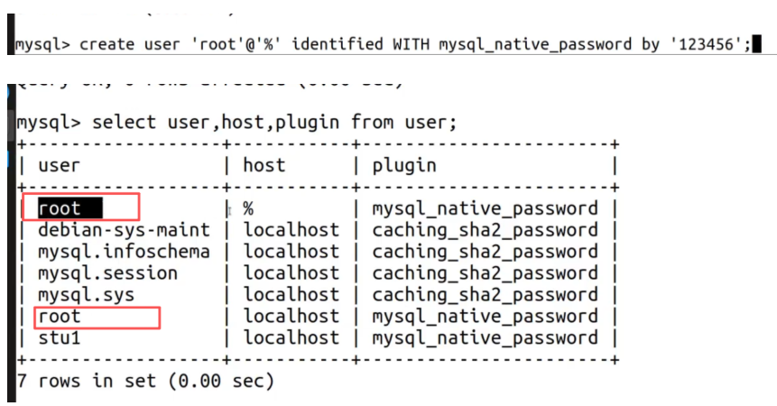 select user,host,plugin from user;执行后会显示当前所有用户及其允许的连接主机、密码加密方式。默认情况下,所有用户的
