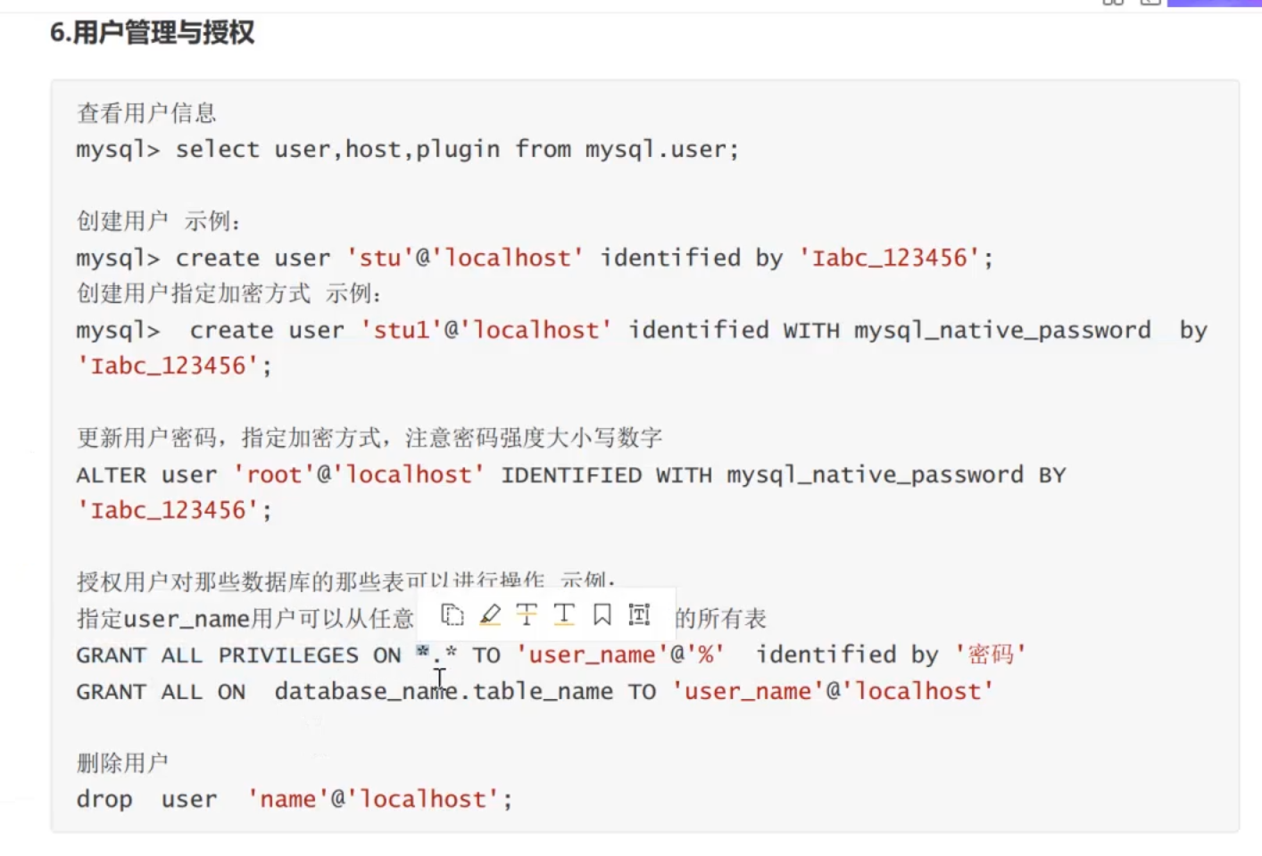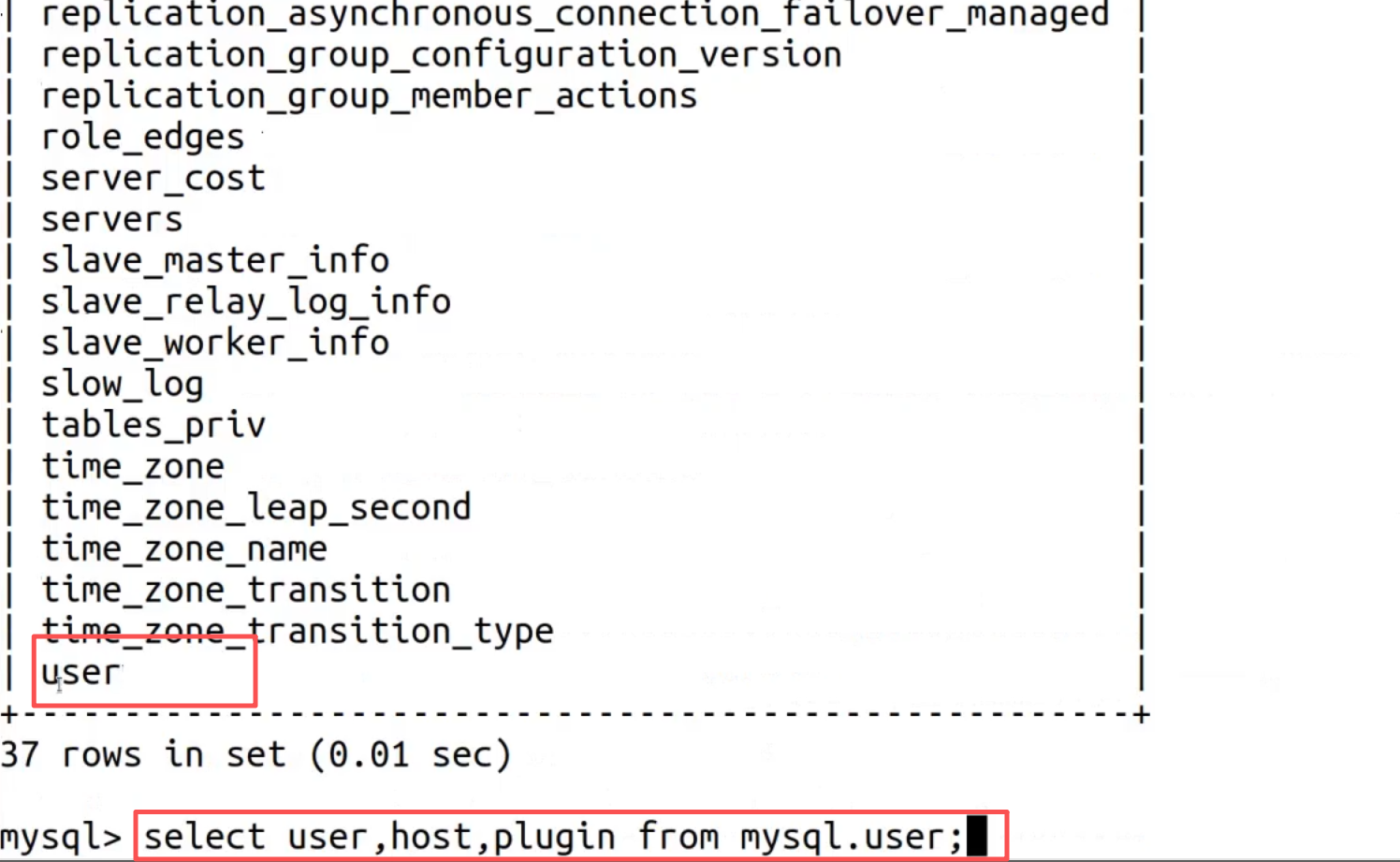 . select user,host,plugin from mysql.user; → 查看当前所有用户的核心信息