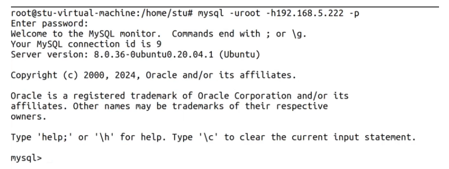 在另一台电脑的终端中,使用以下命令连接远程 MySQL 服务器(替换为目标服务器的 IP):