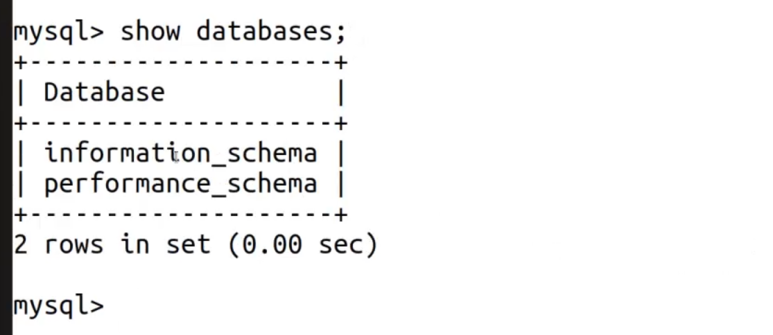 show databases;,你会发现一开始只能看到information_schema和performance_schema这两个默认数据库。 -