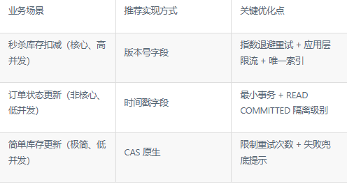 - 乐观锁更新操作应作为"最小事务"执行,避免事务中包含查询、远程调用等耗时操作;