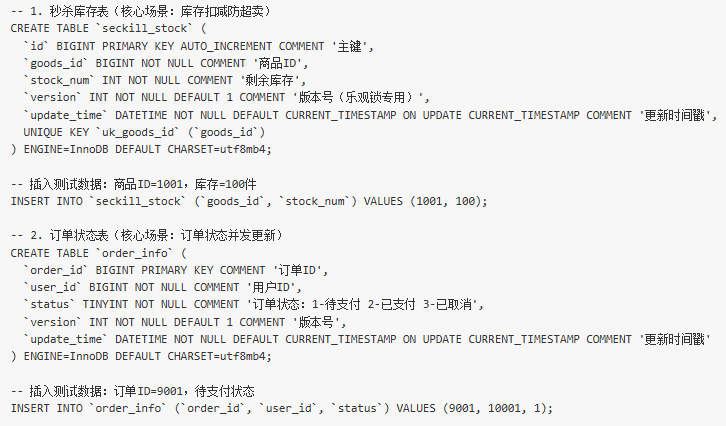 为复现并发场景,先创建 2 张核心表并插入测试数据: