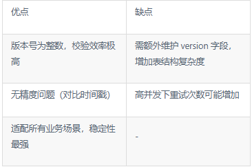 - 更新数据时,WHERE条件必须包含"当前读取的 version",且更新时将 version + 1;