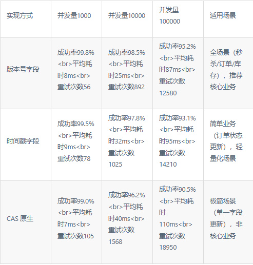为验证三种方式的性能,模拟 1000/10000/100000 并发请求(秒杀库存扣减,初始库存 1000),测试指标包括成功扣减率 、平均耗时 、冲突重试次数 ,结果如下: