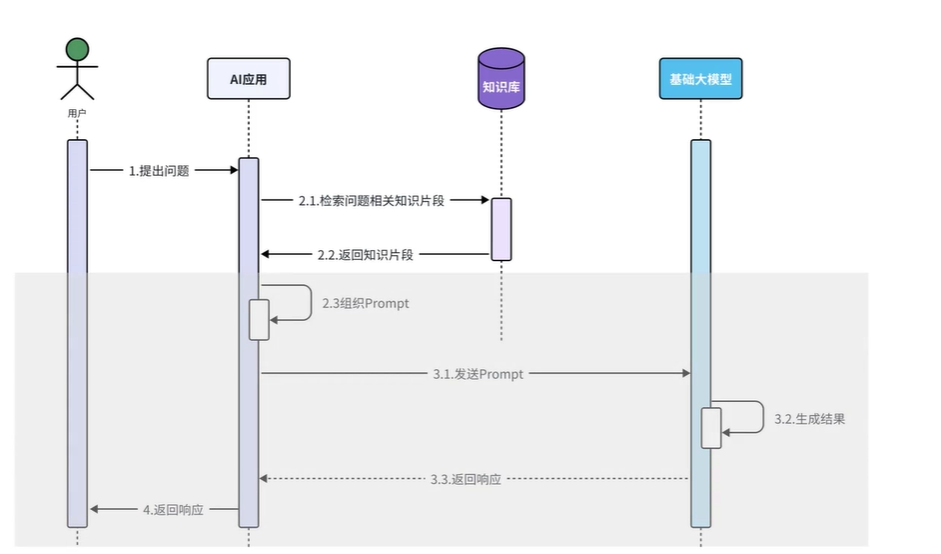 当用户把问题发送给AI应用,AI应用会先根据用户的问题从知识库中检索对应的知识片段,得到知识片段后AI应用需要结合用户的问题以及知识库中检索到的知识片段组织要发送给大模型的消息,大模型接收到消息后会同时根据用户的问题、知识库检索到的知识片段以及自身的知识储备,生成对应的结果响应给AI应用,最终再返回给用户。
