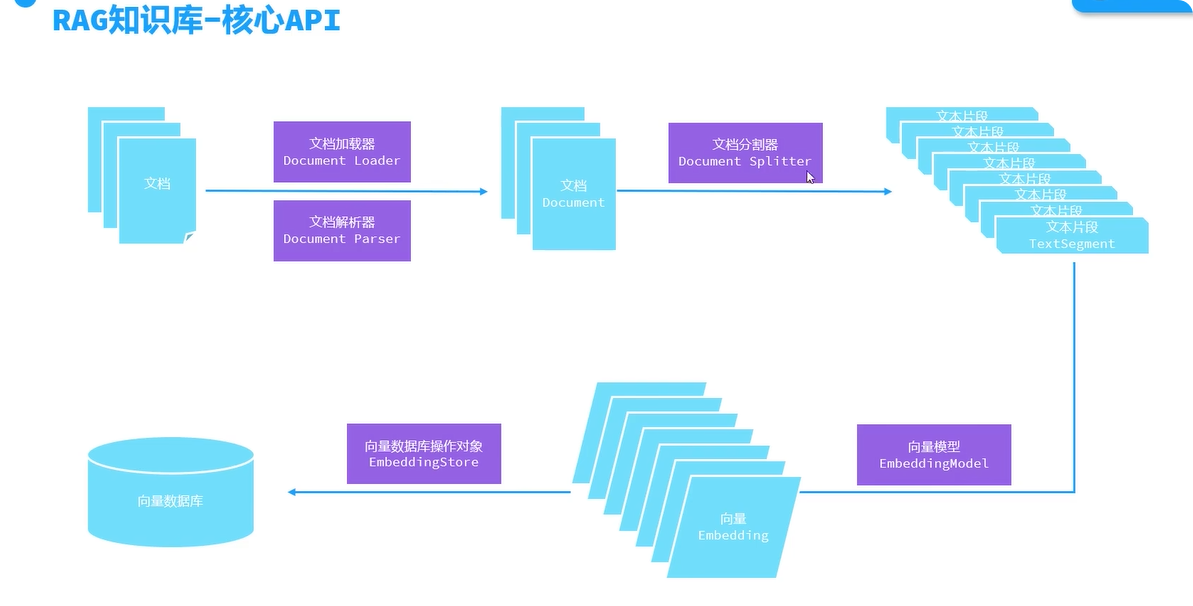 在整个流程中,主要用到了文档加载器、文档解析器、文档分割器、向量模型以及向量数据库操作对象 这五类API,等会儿咱们挨个讲解。其中有关文档分割器、向量模型、还有向量数据库操作对象的具体方法的调用都被封装到了EmbeddingStoreIngestor 中了,对于咱们来说无需过多关注,我们主要关注的是使用哪种文档分割器、哪种向量模型、哪种向量数据库操作对象即可,将来用哪种把哪种交给EmbeddingStoreIngestor就可以了。
