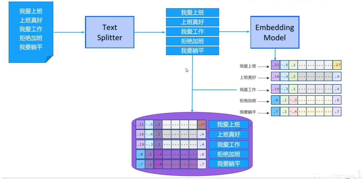 比如我有一个大的文档,里面存储了一些文本信息,接下来借助于文本分割器把大的文档切割成一个一个的文本片段,比如这里切割为我爱上班、上班真好、我爱工作、拒绝加班、我要躺平这五个小片段。紧接着使用向量模型把文本片段转化为向量,那我们之前聊过所谓的向量在坐标系中表示就是记录每一个轴的坐标,说白了就是一堆数字,最后再把每一个向量和其对应的文本片段组合成一条一条的数据存储到向量数据库中。
