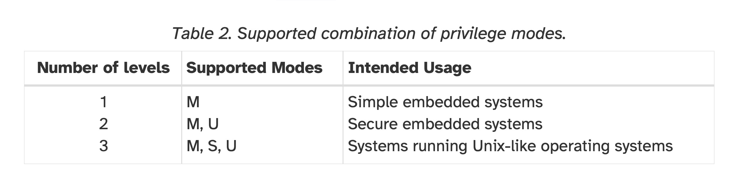 实现可能提供1到3个特权模式,以较低的实现成本换取较弱隔离性,如表2所示。