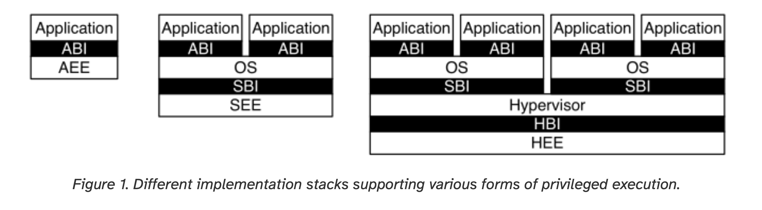 图1. 支持各种形式特权执行的不同实现栈。