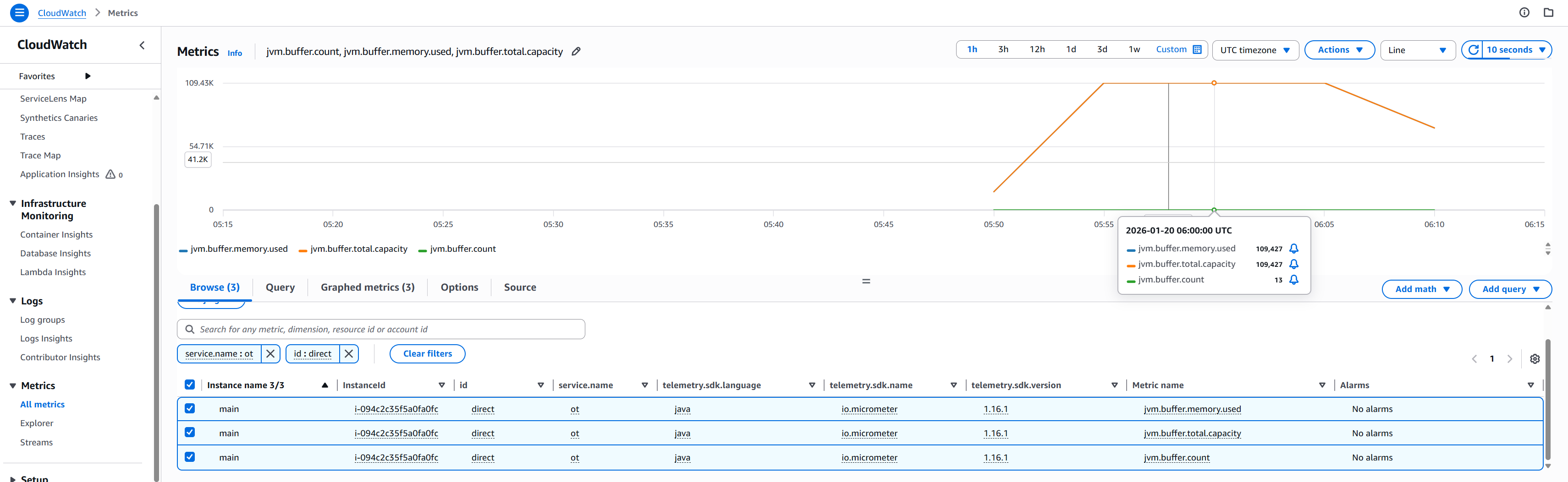 2026-01-20T06:11:11.030Z INFO 32635 --- [ot] [main] [] i.m.c.instrument.push.PushMeterRegistry : Publishing metrics for OtlpMeterRegistry every 1m to http://localhost:4318/v1/metrics with resource attributes {service.name=ot}