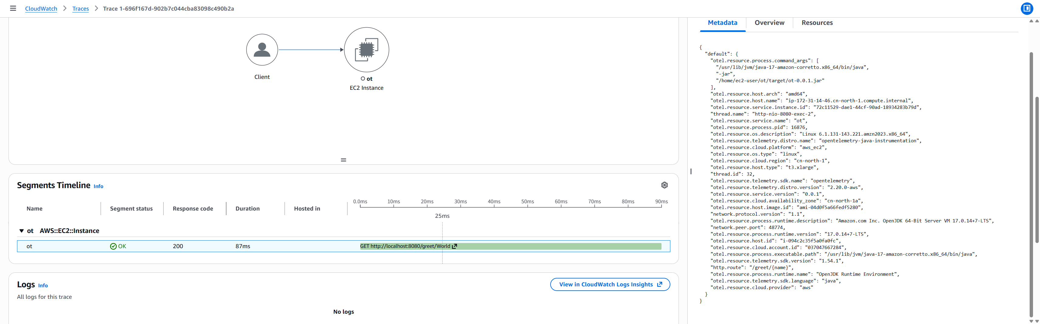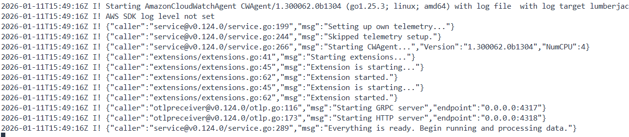 启动日志如下,可见已经成功监听4318端口。应用程序将遥测数据发送到此端点,CloudWatch 代理则将其转发到 X-Ray 和 CloudWatch。