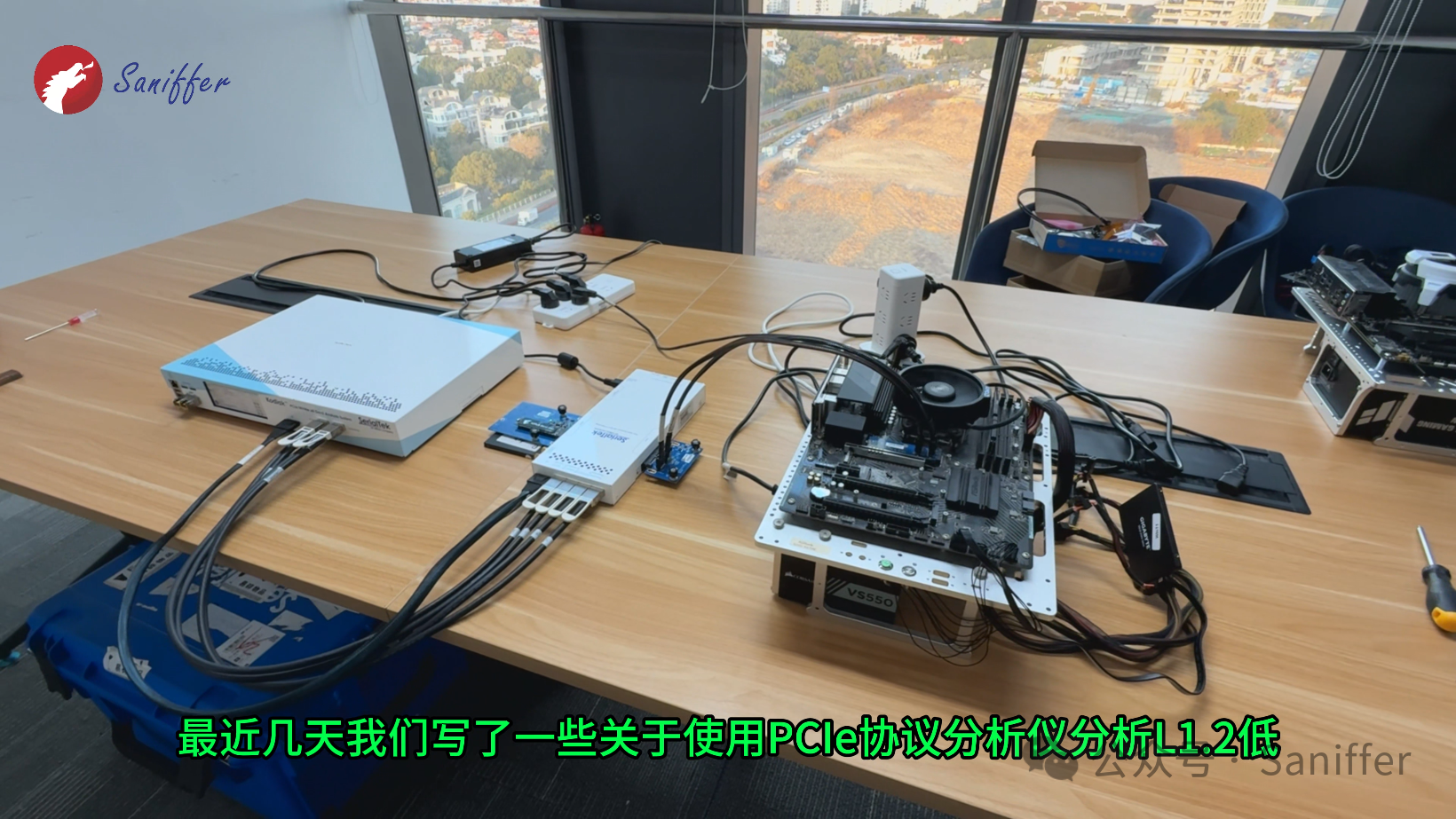 通过一台真实的台式机 + 实物设备, 直观展示 PCIe / NVMe 协议分析仪是如何"无侵入式"地串接在 CPU 与 M.2 SSD 之间的。