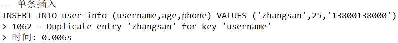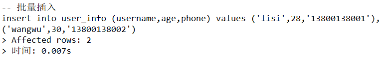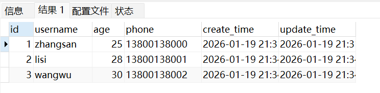 INSERT INTO user_info (username, age, phone) VALUES ('zhangsan', 25, '13800138000');