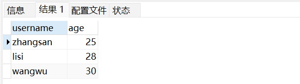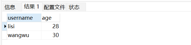 -- 指定字段查询:只查用户名和年龄
